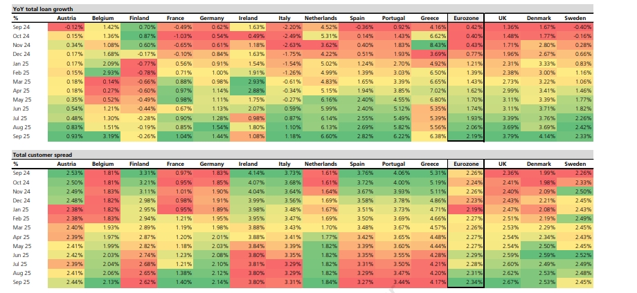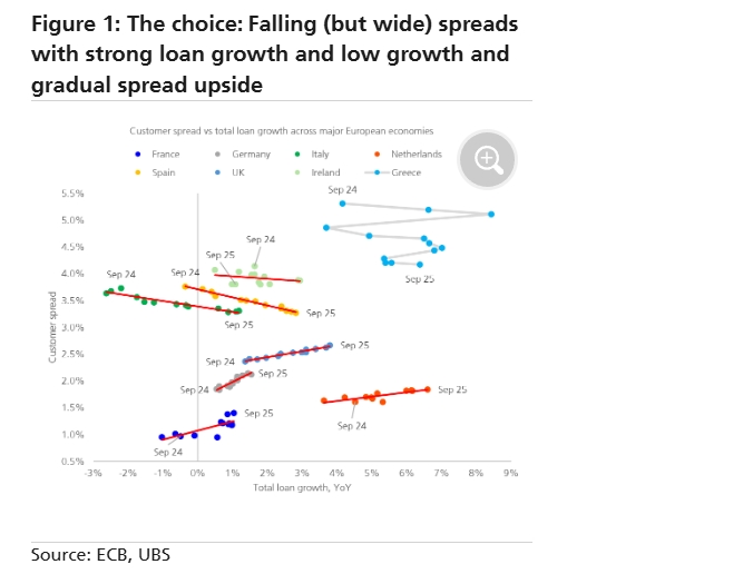 Ωστόσο, εάν η άμυνα και οι αμυντικές δαπάνες αυξηθούν σύμφωνα με τις ελπίδες της αγοράς, γεγονός που στηρίζει τη συνεχιζόμενη επιτάχυνση της αύξησης των δανείων και των καταθέσεων και εμποδίζει την ΕΚΤ να μειώσει τα επιτόκια, είναι πιθανό οι επενδυτές να στραφούν σε απλούστερες τράπεζες σε αγορές με ευρύτερα spreads και καλύτερη αύξηση των δανείων. Το χάσμα μεταξύ των αγορών γρήγορης και αργής μετακύλισης των επιτοκίων και στις δύο περιπτώσεις είναι μεγάλο, όπως σημειώνει η UBS.