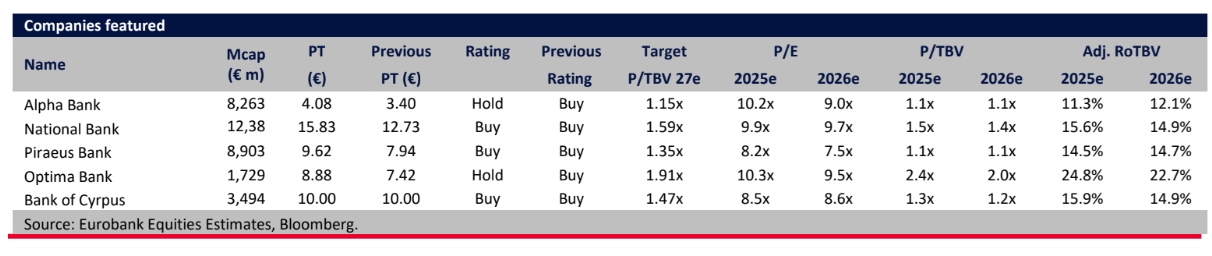 Ωστόσο, μειώνει την αξιολόγησή της για: 1) την Alpha Bank (hold), όπου βλέπει πιο περιορισμένη άνοδο δεδομένου του προφίλ απόδοσης των ιδίων κεφαλαίων (RoTE) και του χάσματος RoTE >2% έναντι της Πειραιώς, και 2) Optima (hold), όπου η τιμή στόχος ενσωματώνει ήδη ένα αρκετά πλούσιο P/TBV 2027 ύψους 1,9x. Η Πειραιώς παραμένει η κορυφαία της επιλογή, με την Τράπεζα Κύπρου να ακολουθεί δεύτερη.