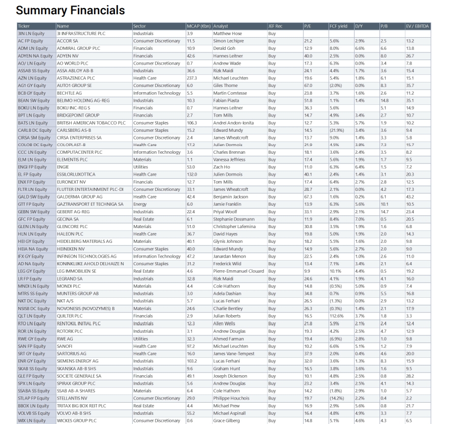 Συνολικά, οι 53 ευρωπαϊκές μετοχές που συστήνει η Jefferies για το 2026 - με τις τιμές-στόχους, τις εκτιμήσεις για τα P/E, τις μερισματικές αποδόσεις, τα P/B και τα EV/EBITDA, είναι οι εξής: