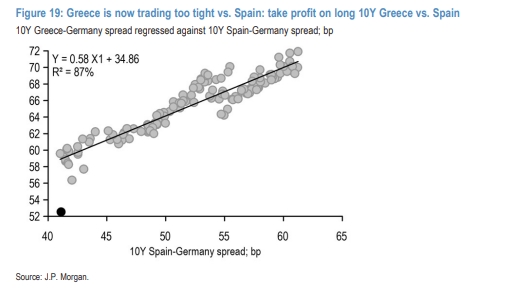 Σήμερα το spread της Ελλάδας έναντι της Γερμανίας είναι στις μόλις 55 μ.β και έναντι της Ισπανίας στις 43 μ.β. Συνεπώς τα ελληνικά ομόλογα είναι μόλις 12 μονάδες πιο ακριβά από τα ισπανικά και η JPM θεωρεί πως αυτό ίσως και να είναι υπερβολικό. Τον τελευταίο μήνα το μεταξύ τους spread έχει υποχωρήσει κατά 6 μονάδες βάσης. Συνεπώς προτείνει κλείσιμο των θέσεων που είχε συστήσει για overweight στα 10ελληνικά ομόλογα έναντι των 10ετών ισπανικών, οι οποίες και έχουν δώσει σημαντικά κέρδη ήδη.