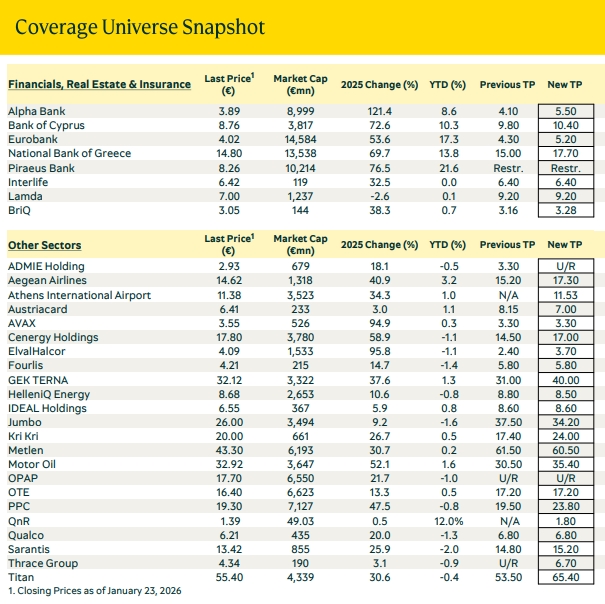 Στα top picks της για το 2026 τοποθετεί τις Alpha Bank, Eurobank, ΓΕΚ Τέρνα, Jumbo, ΔΕΗ και TITAN. Κατά την χρηματιστηριακή, τα βασικά θέματα του Χ.Α φέτος θα είναι τα εξής: