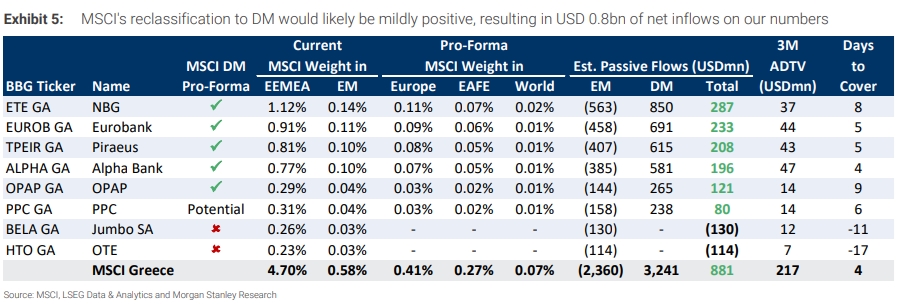 Σύμφωνα με την ανάλυση της MSCI, πέντε ελληνικές μετοχές θεωρούνται πιθανό να ενταχθούν στους βασικούς δείκτες MSCI DM με βάση τα τρέχοντα επίπεδα τιμών. Πρόκειται για την Εθνική Τράπεζα, τη Eurobank, την Τράπεζα Πειραιώς, την Alpha Bank και τον ΟΠΑΠ