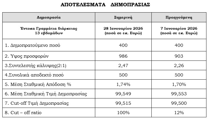 Όπως επισημαίνει ο ΟΔΔΗΧ, η δημοπρασία πραγματοποιήθηκε μέσω των Βασικών Διαπραγματευτών Αγοράς (Primary Dealers), και η ημερομηνία διακανονισμού είναι η Παρασκευή 30 Ιανουαρίου 2026.