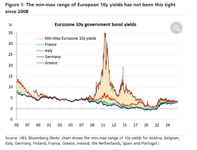 Εν μέρει ως αποτέλεσμα της βελτίωσης της δυναμικής του χρέους στην περιφέρεια και της επιδείνωσης της δυναμικής του χρέους στον "πυρήνα της Ευρώπης" (Γαλλία, Γερμανία), το ελάχιστο-μέγιστο εύρος των ευρωπαϊκών αποδόσεων έχει μειωθεί στις 60 μονάδες βάσης, ένα επίπεδο που δεν έχουμε δει από το 2008, επισημαίνει η UBS.