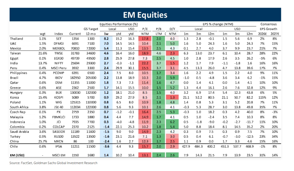 Σε νέα της έκθεση για τις αναδυόμενες αγορές, η Goldman διατηρεί την overweight στάση της για τις ελληνικές μετοχές, και αναβαθμίζει την εκτίμησή της για τον Γενικό Δείκτη στις 2.500 μονάδες καθώς ξεπέρασε το επίπεδο που είχε θέσει η αμερικάνικη τράπεζα προηγουμένως ως στόχο, τις 2.300 μονάδες