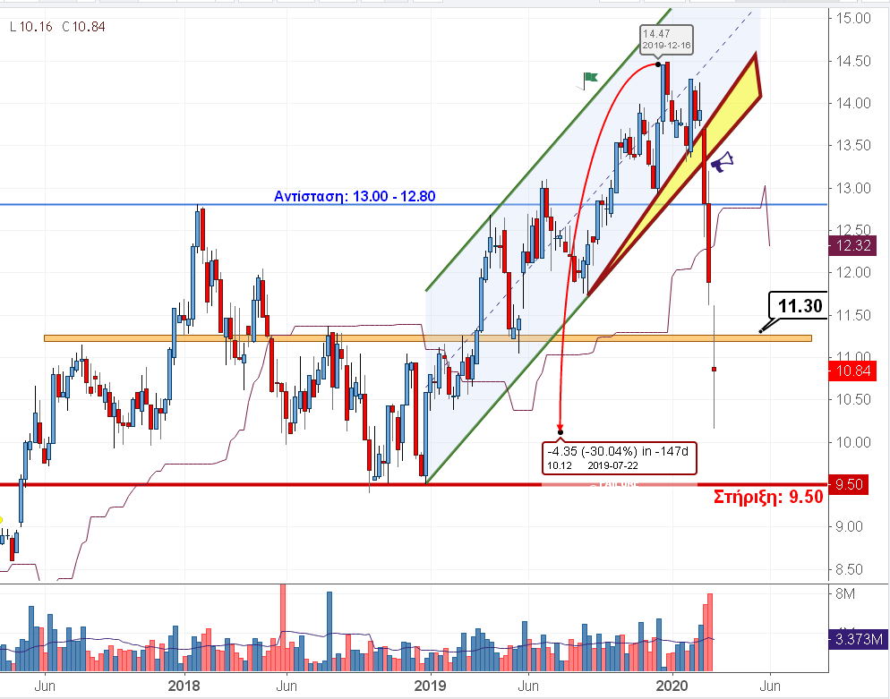 Ο ΟΤΕ, όπου στην πρόσφατη έκθεση της Citigroup αναφέρεται πως ανακοίνωσε για το 2019 τα καλύτερα οικονομικά αποτελέσματα που έχει παρουσιάσει εταιρεία τηλεπικοινωνιών της Ευρώπης εδώ και πολλά χρόνια, με την εκτίμηση πως η μετοχή του οργανισμού έχει ισχυρά περιθώριο ανόδου. Μια εταιρεία, όπου έχει καταφέρει από το 2010 έως το 2019 να περιορίσει τον καθαρό δανεισμό της από τα 4,3 δισ. ευρώ στα 655 εκατ. ευρώ δηλαδή μιλάμε για μια πτώση 85%. Μία εταιρεία όπου έχει δυνατές συστάσεις αγοράς από J.P. Morgan, Barclays, Goldman Sachs, Bank of America, Citigroup και NewStreet. Μία εταιρεία τέλος, όπου έχει μπει με το δεξί στη μεγαλύτερη πρόκληση της επόμενης δεκαετίας, το ψηφιακό μετασχηματισμό. Μια τέτοια λοιπόν εταιρεία έχει χάσει ένα -30% από τα υψηλά του έτους, λόγω των "ανησυχιών" για τις παράπλευρες επιπτώσεις από τον κοροναϊό στις καταναλωτικές δαπάνες. Τεχνικά η μετοχή έχει περάσει κάτω από τη στήριξη της περιοχής των 11,60 με 11,30 ευρώ, ανοίγοντας διάλογο με τα 10 ευρώ. Σε περίπτωση που η τιμή της μετοχής τμήσει καθοδικά τα 10 ευρώ τότε θα βρεθεί σε μετωπική ψυχολογικής πίεσης με το επίπεδο σθεναρής στήριξης των 9,50 με 9 ευρώ.