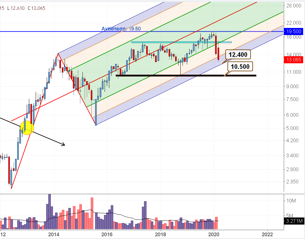 Τέλος για τη Jumbo η Euroxx σε έκθεσή της στις 10 Μαρτίου αναφέρει ότι οι ελεύθερες ταμειακές ροές αναμένεται να ανέλθουν στα 135 εκατ. ευρώ ή στο 49% των EBITDA το 2020-2022, κάτι που αφήνει την εταιρία με καθαρό ταμείο ύψους 3,9 ευρώ ανά μετοχή ως τα τέλη του 2022. Το γεγονός αυτό μπορεί να δώσει την ευχέρεια για αυξημένα μερίσματα, εκτιμώντας ότι η εταιρία θα διανείμει μέρισμα 0,67 ευρώ για τη φετινή χρήση και 0,71 ευρώ το 2021. Παρά τα τροφαντά οικονομικά δεδομένα και αυτή η εταιρεία έπεσε θύμα του ιού χάνοντας ένα -36% από τα υψηλά της. Τεχνικά η μετοχή στο μηνιαίο διάγραμμα τιμών κινείται προς τη κάτω πλευρά του τελευταίου ανοδικού καναλιού του μακροπρόθεσμου Pitchfork σχηματισμού, στα 12.40 ευρώ. Καθοδική διάρρηξη του εν λόγω pattern θα προκαλέσει περαιτέρω βύθιση προς τη πολύ σκληρή για να πεθάνει στήριξη των 10.50 ευρώ.