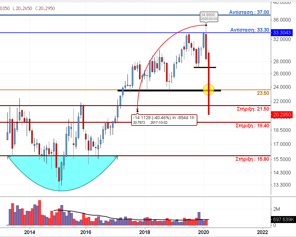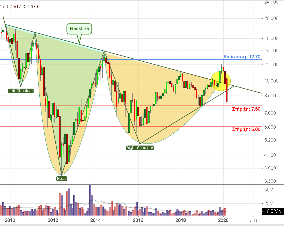 Ο ΟΠΑΠ ένα από πιο ισχυρά μετοχικά top picks για το 2020 με πλήθος αναλύσεων από ισχυρούς οίκους, με τιμές στόχους άνω των 14 ευρώ, με ισχυρές ταμειακές ροές, με πιθανό άλλο 1 ευρώ μέρισμα (έχει δώσει ήδη 1 ευρώ στις 16 Ιανουαρίου από παρελθοντικά κέρδη) και όμως η μετοχή εν μέσω των γνωστών ανησυχιών έχει χάσει ένα -40%. Την ίδια ώρα στο μηνιαίο chart έχει απροσδόκητα καταστρατηγηθεί η ανοδική ένδειξη λύσης του σχηματισμού Head and Shoulders τον περασμένο Νοέμβριο επαναφέροντας τη μετοχή πάνω στην επικίνδυνη στήριξη των 7,50 ευρώ. Περιοχή, όπου εάν διερραγεί καθοδικά θα δώσει κατηφορικό πεδίο για τα 6 ευρώ ! επίπεδο φυσικά που δεν αντικατοπτρίζει με καμιά δύναμη τη σημερινή οικονομική εικόνα του ΟΠΑΠ.
