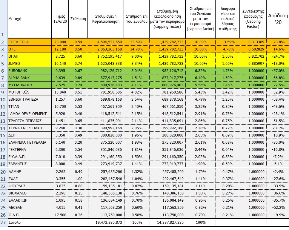 Το φανερό είναι η μείωση της στάθμισης της Coca Cola HBC από 23,59% σε 10% (-3,15 δισ. ευρώ) και του ΟΤΕ από 14,7% σε 10% (-1,42 δισ. ευρώ). Από την άλλη πλευρά, ΟΠΑΠ και JUMBO παρά το γεγονός ότι θα μειώσουν τη συνολική σταθμισμένη κεφαλαιοποίηση που θα συμμετέχουν στον δείκτη (ΟΠΑΠ από 1,75 δισ. ευρώ σε 1,44 δισ. ευρώ & Jumbo από 1,63 δισ. ευρώ σε 1,44 δισ. ευρώ) λόγω του capping factor, σαν ποσοστό συμμετοχής θα αυξηθεί από το 9,00% (ΟΠΑΠ) και 8,34% (JUMBO) σε 10% και για την κάθε εταιρία.