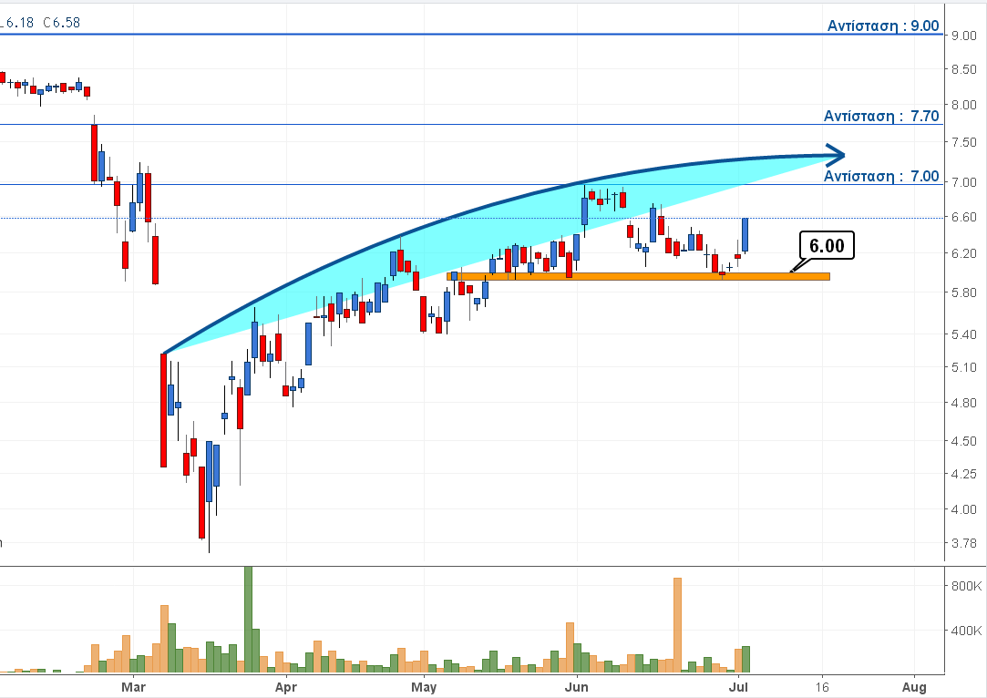 Η ΓΕΚΤΕΡΝΑ έχει έναν λόγο παραπάνω για να "γιορτάσει" με την υπερκάλυψη κατά μιάμιση φορά του επταετούς ομολόγου, λαμβάνοντας προσφορές 700 εκατ. ευρώ ενώ ζητούσε 500 εκατ. ευρώ. Από ό,τι φαίνεται η πράσινη ενέργεια έχει κεντρίσει το ενδιαφέρον μεγάλων θεσμικών επενδυτών δημιουργώντας χώρο για τη μετοχή προς τα 7 ευρώ. Αναλυτικότερα στο ημερήσιο διάγραμμα τιμών η τιμή της μετοχής χτυπάει με άγριες διαθέσεις την αντίσταση της ζώνης των 6,54 με 6,60 ευρώ. Επιβεβαιωμένη διέλευση άνω των 6,60 ευρώ με αυξημένο όγκο συναλλαγών θα δώσει λαβές στους Bulls για ένα ταξιδάκι προς την ευρύτερη περιοχή αντίστασης των 7 με 7,70 ευρώ, αλλάζοντας έτσι το όλο μεσοπρόθεσμο τοπίο. Πάντως μέχρι τώρα το επίπεδο των 6 ευρώ έχει αναγνωριστεί ως εξαιρετική βάση αγοράς των swing επενδυτών.