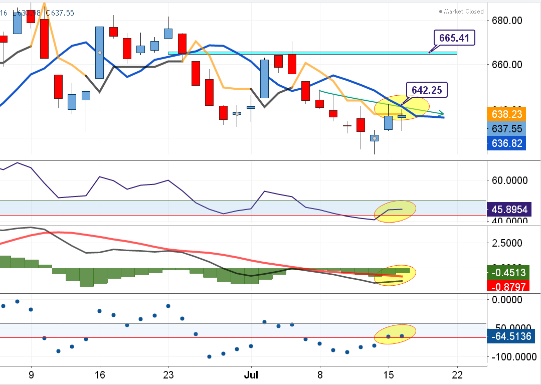Από την εμπεριστατωμένη τεχνική ανάλυση του Γενικού Δείκτη το σημείο που εμφανίζεται να παίζει ρόλο στη βραχυχρόνια ανοδική φυγή είναι η περιοχή όπου "κροσάρουν" οι 3 διαγραμματικοί δείκτες, στις 643 με 645 μονάδες. Η ανοδική τμήση τους θα ωθήσει τον Γενικό Δείκτη να κατασκευάσει σκαλοπάτια προς τη ζώνη των 660 με 665 μονάδων. Επίσης ο δείκτης Σχετικής Ισχύος (RSI) δείχνει να έχει περάσει πάνω από τις 45 μονάδες τεχνικού δείκτη αποχαρακτηρίζοντας την oversold κατάσταση, ενώ o γρήγορος MACD έχει πάρει μετά από πολλές συνεδριάσεις μια ανοδική κλίση τμήσης του Signal κινητού. Τέλος ο ταλαντωτής Williams %R έχει διέλθει στην ουδέτερη ζώνη περνώντας πάνω από τα διόδια των έντονα πτωτικών ρευστοποιήσεων.