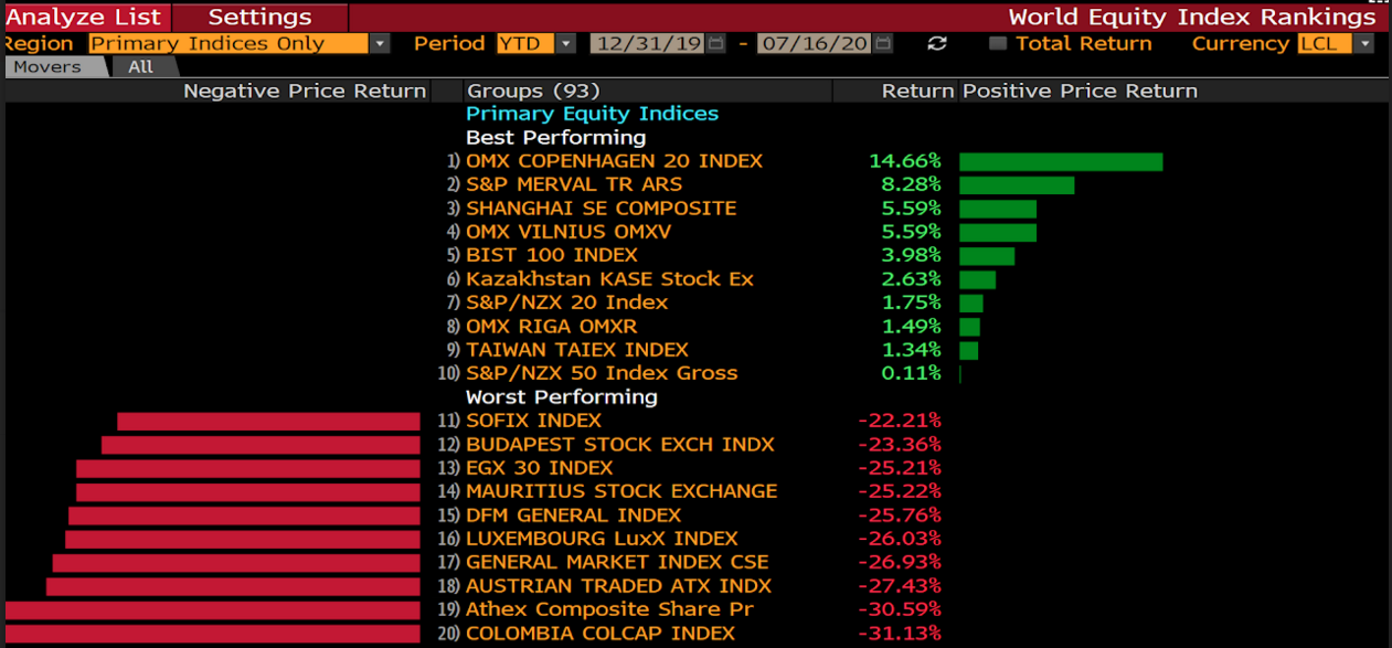 Τη δεύτερη χειρότερη απόδοση για το 2020 έχει παγκοσμίως ο Γενικός Δείκτης του Ελληνικού Χρηματιστηρίου καθήμενος στα -30,59% λίγο πιο κάτω από το -31,13% του Colcap Index της Bolsa de Valores de Colombia. Οι δε όγκοι των συναλλαγών που λαμβάνουν χώρα στις συνεδριάσεις του Ελληνικού Χρηματιστηρίου από τις αρχές Ιουλίου έως και σήμερα είναι πολύ κοντά στο... κάτσε Τούρκο να γεμίσω. Οι ενεργοί επενδυτές εμφανίζονται να διαθέτουν εμπροσθογενή τουφέκια με το όριο των 30 εκατ. μετοχών να έχει ξεπεραστεί μόνο κατά την πρώτη μέρα του μήνα.