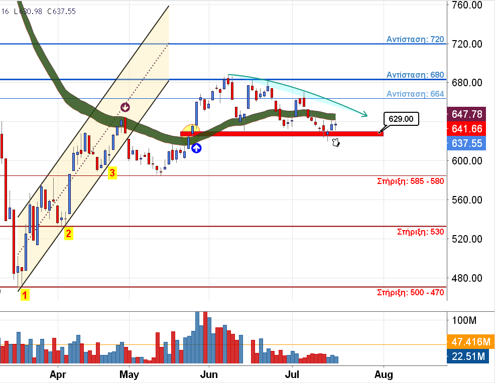 Υπό αυτό το καθεστώς ο Γενικός Δείκτης έχει πάθει το τεχνικό σύνδρομο του Δ.Δ.Δ. (Διαγραμματικά Δολίως Διολισθαίνω) από τα υψηλά των πρόσφατων 670,31 μονάδων προς τις 619,53 μονάδες καταγράφοντας απώλειες έως και -7,57%. Το μόνο γλυκαντικό στην πικρή πτωτική γεύση του Ιούλη είναι η αποκοπή μερισμάτων από αρκετές δεικτοβαρείς εταιρείες.