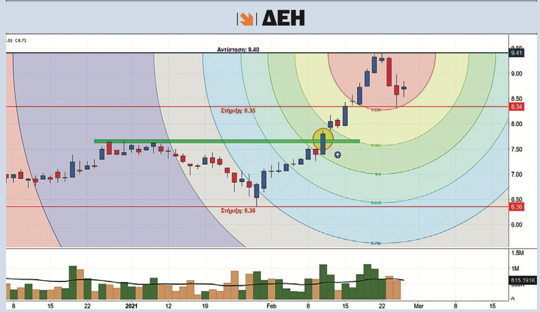 Τέλος, και η ΔΕΗ ετοιμάζεται να βγει στις αγορές με το "πράσινο ομόλογο" του 1 δισ. ευρώ, γνωστό ως SLB (Sustainability Linked Bond), με ένα επιτόκιο πέριξ του 3%. Η ΔΕΗ μέχρι τώρα δεν έχει δώσει περαιτέρω στοιχεία, αλλά ένα είναι το σίγουρο, ότι ο σκοπός του δανεισμού θα είναι για την επέκτασή της στον τομέα των ΑΠΕ βάσει του τετραετούς αναπτυξιακού πλάνου των 3,5 δισ. ευρώ. Τεχνικά, η μετοχή της ΔΕΗ έχει διαπρέψει, καθώς έχει πραγματοποιήσει από τα τέλη του Γενάρη μια άνοδο της τάξεως του +48%, προσεγγίζοντας το επίπεδο αντίστασης των 9,40 με 9,50 ευρώ. Τώρα συλλαμβάνεται να πραγματοποιεί ένα υγιές pullback προς το 23,6% διορθωτικό επίπεδο των Fibonacci Arcs. Σύμφωνα με αυτό, το όριο της πτωτικής κίνησης εντοπίζεται στο εύρος διακύμανσης των 8,35 με 8 ευρώ.