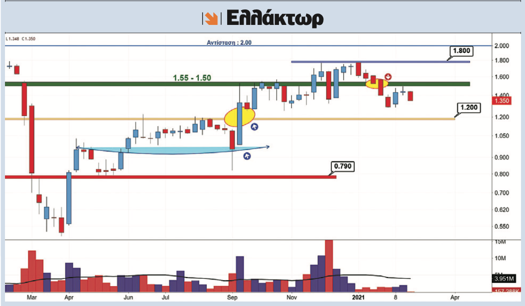 Στην αύξηση του μετοχικού κεφαλαίου ποσού 50 έως 100 εκατ. ευρώ είναι πολύ πιθανό να καταφύγει και η νέα διοίκηση της Ελλάκτωρ, παρά την καταψήφιση, δίνοντας ένα ισχυρό χέρι βοηθείας στην αναπτυξιακή πορεία του ομίλου. Ένα μέρος από αυτή θα μπορούσε να δοθεί και για τη μερική αναχρηματοδότηση με βελτιωμένους όρους του "επώδυνου" ομολογιακού δανείου των 670 εκατ. ευρώ που λήγει το 2024 με το ιδιαίτερα υψηλό κουπόνι του 6,37%. Διαγραμματικά, η μετοχή αποτυπώνεται να ταλανίζεται κάτω από την περιοχή αντίστασης των 1,55 με 1,50 ευρώ. Η συνεχής αδυναμία διαπερατότητας έχει δημιουργήσει συνθήκες πιθανής διερευνητικής καθοδικής κίνησης προς τα 1,30 με 1,20 ευρώ, επιβαρύνοντας ακόμα περισσότερο τη μέχρι τώρα εικόνα δυσπραγίας.
