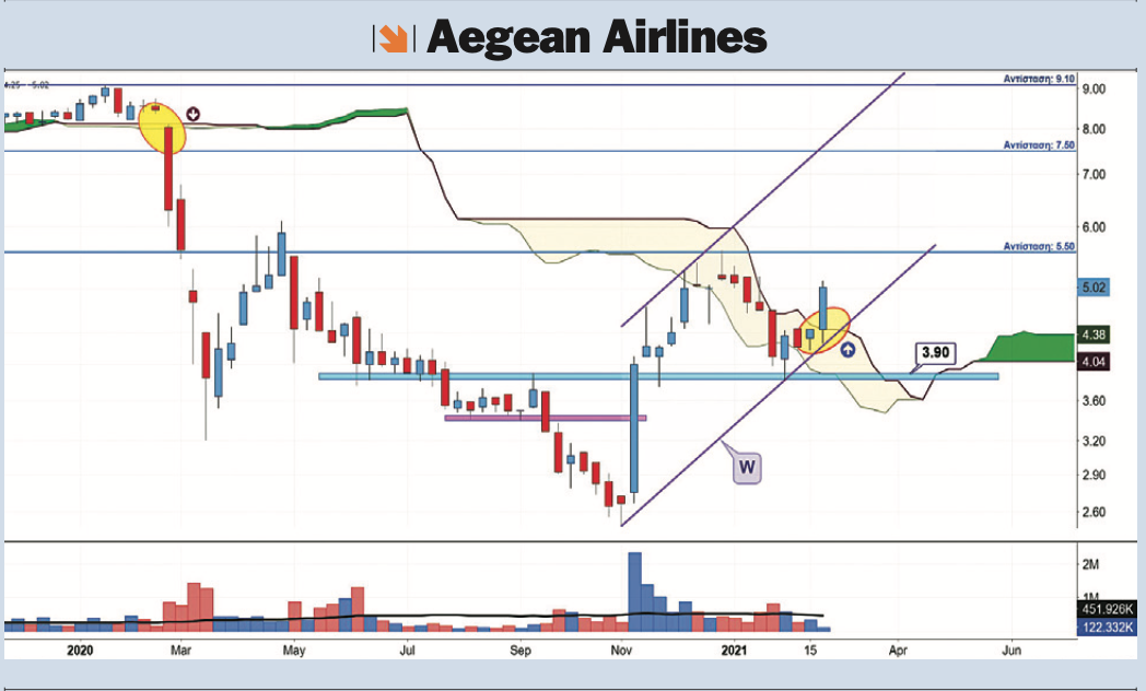 Προχωράμε στην Aegean Airlines (ΑΡΑΙΓ), η οποία θα δρομολογήσει στην έκτακτη γενική συνέλευση στις 12 Μαρτίου την αύξηση μετοχικού κεφαλαίου ύψους 60 εκατ. ευρώ με κατάργηση ή περιορισμό του δικαιώματος προτίμησης των παλαιών μετόχων. Η επιτυχής ολοκλήρωση της κίνησης αυτής θα ξεκλειδώσει την καταβολή της κρατικής ενίσχυσης των 120 εκατ. ευρώ. Διαγραμματικά, η μετοχή, μετά και την είδηση για το άνοιγμα της βρετανικής αγοράς, έχει να μας δηλώσει αρκετές θετικές ενδείξεις, με προεξέχουσα αυτή της ανοδικής διάσπασης έπειτα από σχεδόν 370 μέρες του μεσοπρόθεσμου τεχνικού δείκτη Ichimoku Cloud, στα 4,42 ευρώ. Εδώ, όσο η τιμή της μετοχής αναπνέει πάνω από το εν λόγω νεφέλωμα, τόσο θα ανοίγει τον δίαυλο επικοινωνίας με την περιοχή αντίστασης των 5,50 και των 6 ευρώ. Θετικό είναι, επίσης, και το πάτημα που έχει επιτευχθεί καθ’ όλη τη διάρκεια του Φλεβάρη στην κάτω πλευρά του ανοδικού καναλιού "W", δίνοντας μέχρι τώρα ένα σημαντικό μηνιαίο ανοδικό ποσοστό της τάξεως του +23,6%.