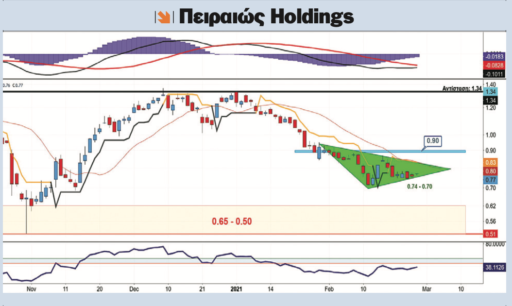 Η πρώτη και πιο "βαριά" αύξηση μετοχικού κεφαλαίου ετοιμάζεται πιθανότατα μέχρι τα τέλη Μαρτίου από την Πειραιώς Holdings (ΠΕΙΡ), ανακοινώνοντας την τιμή, τους όρους και το ύψος της αύξησης, το οποίο έχει αρχικά εκτιμηθεί σε 1 δισ. ευρώ. Κεφάλαιο το οποίο θα χρησιμοποιηθεί για να επανέλθει εκ νέου στον δρόμο της ιδιωτικοποίησής της. Το στενό χρονοδιάγραμμα που ορίζουν οι σύμβουλοι της έκδοσης, Goldman Sachs Group και UBS, στοχεύει στην ολοκλήρωση της αύξησης πολύ πριν από την ανακοίνωση των αποτελεσμάτων των stress tests και, ανάλογα με τις συνθήκες που θα υπάρχουν στις αγορές, το ΤΧΣ θα κληθεί να αποφασίσει εάν θα ασκήσει πλήρως ή μερικώς τα δικαιώματά του, με μια μεταγενέστερη διάθεση πακέτου μετοχών. Η τιμή της άσκησης είναι μέχρι τώρα ένα μεγάλο μυστήριο, αν και η συμπεριφορά της μετοχής μαρτυράει πάνω-κάτω το εύρος των 0,65 με 0,50 ευρώ, μιας που από τις αρχές του Φλεβάρη έχει απολέσει το επίπεδο των 0,90 ευρώ και μέχρι τώρα έχει πραγματοποιήσει κάτι παραπάνω από 52 εκατ. τεμάχια δίχως να μπορεί να πάρει ούτε το οφειλόμενο διορθωτικό retracement των 0,80 ευρώ. Διαγραμματικά, η εικόνα δεν είναι και ό,τι καλύτερο για το στρατόπεδο των αγοραστών, καθώς συνεχίζει να κινείται στο χείλος του γκρεμού του σταθεροποιητικού τριγωνικού σχηματισμού. Ημερήσια κλεισίματα κάτω από τη ζώνη στήριξης των 0,74 με 0,70 ευρώ θα ανοίξουν την πόρτα για τον κατηφορικό δρόμο προς τα 0,65 ευρώ. Ισχυρή ανατροπή στο όλο αρνητικό διαγραμματικό σκηνικό μόνο με την αρπαγή των 0,90 ευρώ.