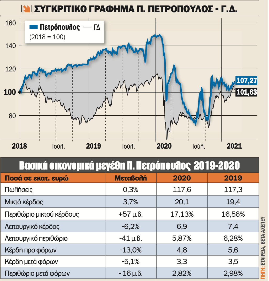 Οι πωλήσεις της Π. Πετρόπουλος μέσα στο 2020 ενισχύθηκαν οριακά (+0,3%) καθώς ανήλθαν στα 117,6 εκατ. ευρώ έναντι 117,3 εκατ. ευρώ το 2019, με το 14% να προέρχονται από το εξωτερικό, κατά κύριο λόγο από χώρες της Ε.Ε. και το υπόλοιπο 86% από την Ελλάδα. Τα λειτουργικά κέρδη υποχώρησαν 6,2% καθώς ανήλθαν στα 6,9 εκατ. ευρώ ενώ το λειτουργικό περιθώριο διαμορφώθηκε στο 5,87% έναντι 6,28% το 2019, ήτοι συρρίκνωση μόλις 41 μ.β. Τα καθαρά κέρδη συρρικνώθηκαν 5,1% καθώς ανήλθαν σε 3,3 εκατ. ευρώ έναντι 3,5 εκατ. ευρώ το 2019. Η συρρίκνωση των πωλήσεων στην πλειοψηφία των κατηγοριών πώλησης οχημάτων αντισταθμίστηκε σε μεγάλο βαθμό από τη σημαντική αύξηση των αγροτικών μηχανημάτων καθώς οι πωλήσεις αυτής της κατηγορίας από 11,3 εκατ. ευρώ το 2019 εκτοξεύθηκαν στα 25,5 εκατ. ευρώ, ήτοι ανάπτυξη 126%, αντιπροσωπεύοντας το 22% των συνολικών πωλήσεων του Ομίλου το 2020 από 9,6% έναν χρόνο νωρίτερα.