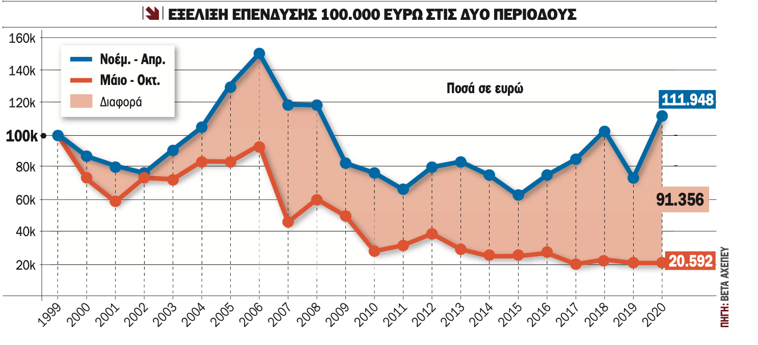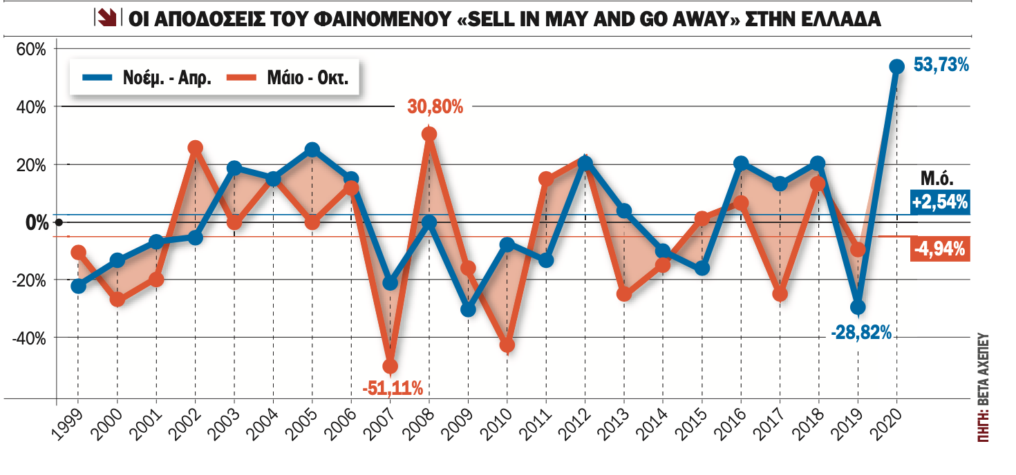 Στην ελληνική χρηματιστηριακή αγορά υπάρχει μια ιδιομορφία, καθώς τα τελευταία 20 και πλέον έτη όποιος είχε αποφασίσει να ακολουθήσει τη στρατηγική "αγοράζω και διακρατώ τις μετοχές χωρίς αγοραπωλησίες" μέχρι και σήμερα θα ήταν χαμένος περί το 71% περίπου, μιας και η τάση ήταν καθαρά πτωτική. Δηλαδή, εάν κάποιος είχε επενδύσει 100.000 ευρώ την 1η Νοεμβρίου 2000 μέχρι και σήμερα θα είχε μόλις 28.756 ευρώ (χωρίς να συμπεριλαμβάνονται τα μερίσματα). Ωστόσο, εάν κάποιος είχε ακολουθήσει τη στρατηγική" Sell in May and go away" θα είχε αποκομίσει κέρδος 11.948 ευρώ, ήτοι σωρευτική απόδοση 12% περίπου (χωρίς να συμπεριλαμβάνονται τα μερίσματα). Στην περίπτωση που ένας επενδυτής ακολουθούσε το αντίθετο, η απόδοσή του θα ήταν -79,4%, δηλ. χειρότερη και από τη διακράτηση. Η στρατηγική "αγοράζω τον Νοέμβριο και πουλώ στο τέλος Απριλίου" δίνει μια μέση απόδοση της συγκεκριμένης περιόδου +2,54%, ενώ η αγορά τον Μάιο και πώληση τον Οκτώβριο διαμορφώνει τη μέση απόδοση -4,94%. Ολοκληρώνοντας, η φετινή απόδοση του διαστήματος Νοεμβρίου-Απριλίου (μέχρι 21 Απριλίου) αποτελεί την καλύτερη επίδοση των τελευταίων 21 ετών με μεγάλη διαφορά από τη δεύτερη (+25,18% το 2005-2006) για τον Γενικό Δείκτη, προσδίδοντας έτσι μεγαλύτερο ενδιαφέρον στη ρήση "Πουλήστε τον Μάιο και φύγετε μακριά". Η ελληνική χρηματιστηριακή αγορά, ωστόσο, δεν έχει ακόμη καταφέρει να βρεθεί στα επίπεδα προ πανδημίας, με την τουριστική περίοδο να έρχεται να κρίνει το κατά πόσο η ελληνική οικονομία θα ανακάμψει επαρκώς το 2021 και το Χρηματιστήριο θα διαψεύσει την ίδια του την ιστορία!