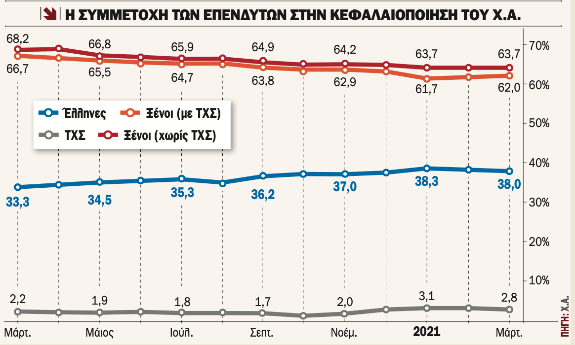 Η συμμετοχή των ξένων επενδυτών στη συνολική κεφαλαιοποίηση της ελληνικής αγοράς τον Μάρτιο ανήλθε σε 61,96%, έναντι 61,88% στις 31 Μαρτίου 2021, καταγράφοντας αύξηση μόλις 8 μ.β. Μη συμπεριλαμβανομένης της συμμετοχής του ΤΧΣ ( 1,33 δισ. ευρώ ή 2,75%) στη συνολική κεφαλαιοποίηση της ελληνικής αγοράς, η συμμετοχή των ξένων επενδυτών ανήλθε σε 63,71% (63,78% τον προηγούμενο μήνα), παρουσιάζοντας πτώση 7 μ.β. συγκριτικά με τον προηγούμενο μήνα. Η κεφαλαιοποίηση του Χ.Α. στις 31/3/2021 υπολογίστηκε στα 48,54 δισ. ευρώ, έναντι 44,87 δισ. ευρώ τον προηγούμενο μήνα, ήτοι ενίσχυση 8,2%, ενώ έναντι του αντίστοιχου περυσινού μήνα σημειώθηκε αύξηση 43,7%. Παράλληλα, συνεχίστηκαν οι εκροές των αλλοδαπών επενδυτών με 55 εκατ. ευρώ, έναντι 8,7 εκατ. ευρώ τον Φεβρουάριο, και 70 εκατ. ευρώ το α’ τρίμηνο του 2021. Οι τρεις μεγαλύτερες καθαρές εισροές των ξένων επενδυτών προήλθαν από την Κύπρο με 137 εκατ. ευρώ, το Λουξεμβούργο με 124 εκατ. ευρώ και την Ιρλανδία με 20 εκατ. ευρώ. Παράλληλα, οι τρεις μεγαλύτερες εκροές αφορούσαν κυρίως τον Ελλάκτωρα, καθώς προήλθαν από την Ολλανδία με 246 εκατ. ευρώ, τη Γερμανία με 36 εκατ. ευρώ και το Βέλγιο με 32 εκατ. ευρώ. Οι ξένοι επενδυτές τον Μάρτιο 2021 πραγματοποίησαν το 57,5% των συναλλαγών (σε σχέση με το 51,1% τον προηγούμενο μήνα, ενώ τον Μάρτιο του 2020 είχαν πραγματοποιήσει το 52,5% των συναλλαγών). Σε ό,τι αφορά τον μέσο όρο των μετόχων των εισηγμένων που συμμετέχουν στον FTSE Large Cap, τη μεγαλύτερη ποσοστιαία αύξηση είχαν οι ΤΕΡΝΑ Ενεργειακή με 6,3% (785 νέους μετόχους), Fourlis με 3,5% (130 νέους μετόχους) και Σαράντης με 2,5% (43 νέους μετόχους). Αντίθετα, οι τρεις εταιρείες με τις μεγαλύτερες ποσοστιαίες απώλειες μετόχων ήταν οι Jumbo με 1,3% (-75 μετόχους), ΟΛΠ με 1,1% (-58 μετόχους) και Aegean Airlines με 0,9% (-375 μετόχους). Στο α’ τρίμηνο του 2021 πρώτες με διαφορά είναι οι μετοχές των reopening trades Fourlis και Jumbo, με τη μέση αύξηση των μετόχων να διαμορφώνεται στο 17,8% και 9,4% αντίστοιχα. Στον αντίποδα, ΟΛΠ, Eurobank, Titan και Coca-Cola HBC, με -1,9%, σημείωσαν τις μεγαλύτερες απώλειες μετόχων στο α’ τρίμηνο του 2021.