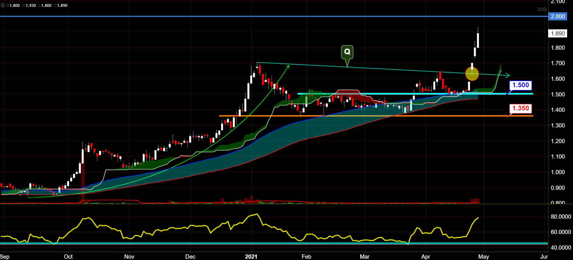 H Byte (ΒΥΤΕ) έκανε την έκπληξη κλείνοντας το 2020 με κύκλο εργασιών 31,66 εκατ. ευρώ, EBITDA στα 3,45 εκατ. ευρώ και περιθώριο EBITDA 10,9%. Τα ίδια κεφάλαια ανήλθαν στις 31.12.2020 σε 15,6 εκατ. ευρώ, ο τραπεζικός δανεισμός σε 6,2 εκατ. ευρώ που όμως υπερκαλύπτεται από τα ταμειακά διαθέσιμά της που ανέρχονταν σε 9,34 εκατ. ευρώ. Η Byte πέρα από το γεγονός των αξιοσημείωτων αποτελεσμάτων συνέβαλε στην αντιμετώπιση της πανδημίας μέσω της ψηφιακής οργάνωσης και της υλοποίησης της άυλης συνταγογράφησης και του Εθνικού Μητρώου Ασθενών που νοσούν από COVID-19. Από τεχνικής απόψεως εμφανής είναι η ανοδική τμήση και απόδραση πάνω από την καθοδική γραμμή τάσης "Q” στα 1,64 ευρώ βάζοντας ως τιμή-στόχο το ψυχολογικό όριο των 2 ευρώ. Πάνω από εκεί η μετοχή θα έχει να αντιμετωπίσει την πολύ μακρινή αντίσταση των 2,90 με 3 ευρώ, που έρχεται από τον Ιανουάριο του 2008.