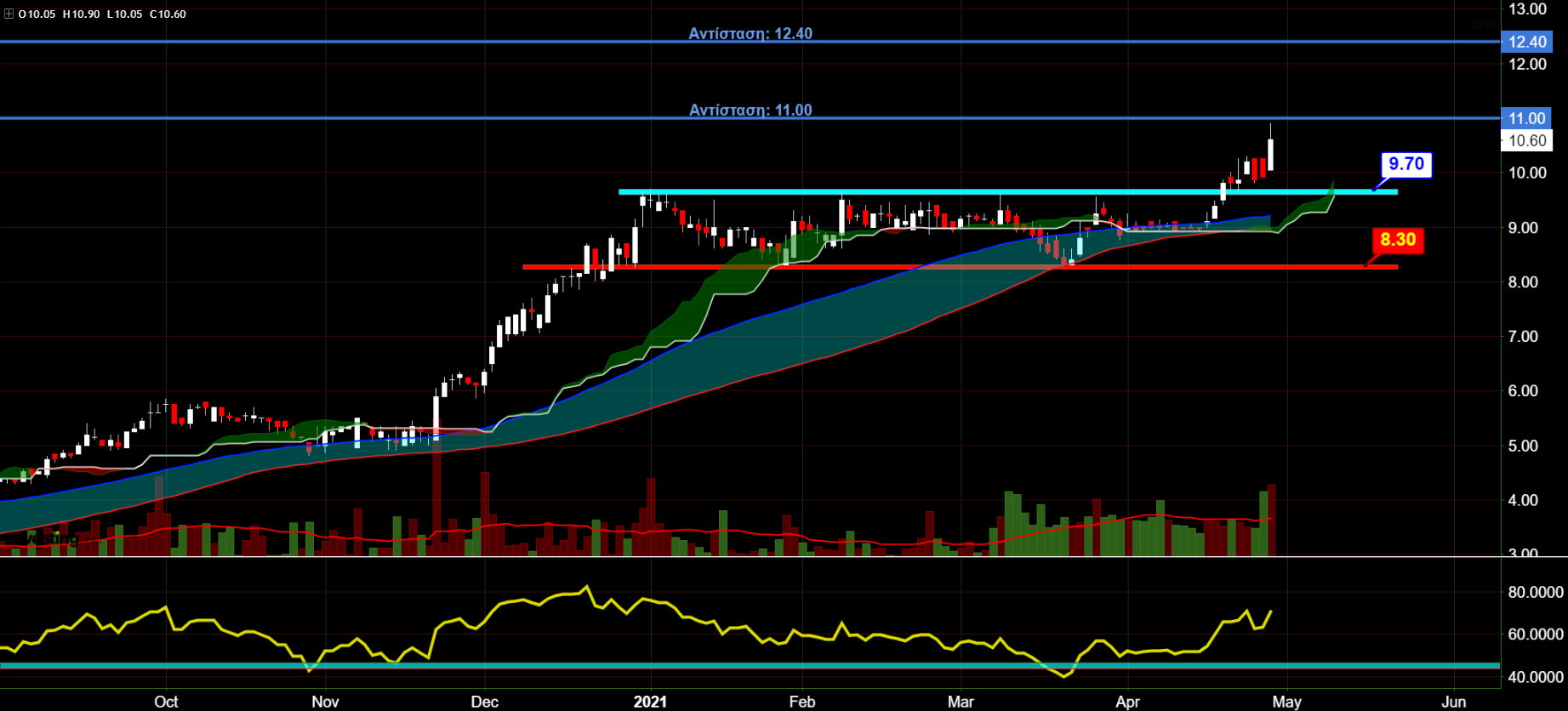 Σημαντικές οικονομικές επιδόσεις για το 2020 πέτυχε και η εταιρεία της Εναλλακτικής αγοράς Performance Technologies (ΠΕΡΦ) κλείνοντας τον κύκλο εργασιών στα 31,3 εκατ. ευρώ, EBITDA στα 4,38 εκατ. ευρώ και περιθώριο EBITDA 14%. Τα ίδια κεφάλαια ανήλθαν στις 31.12.2020 σε 8,05 εκατ. ευρώ, ο τραπεζικός δανεισμός σε 4,2 εκατ. ευρώ, με τα ταμειακά διαθέσιμα της σε 1,75 εκατ. ευρώ (καθαρός δανεισμός 2,45 εκατ. ευρώ). Εδώ διαγραμματικά η εταιρεία έχει διασπάσει ανοδικά τη συσσώρευση που έκανε από τις αρχές του 2021 ανάμεσα στα 9,70 με 8,30 ευρώ, ανοίγοντας το "ταβάνι" για τα 11 ευρώ. Όσο η τιμή της μετοχής κάνει διακράτηση των κεκτημένων πάνω κυρίως από το όριο των 10 ευρώ τόσο θα πρέπει να θεωρούμε δεδομένο το ανοδικό πέρασμα πάνω από τα 11 ευρώ με επόμενο στόχο τα 12,40 ευρώ.