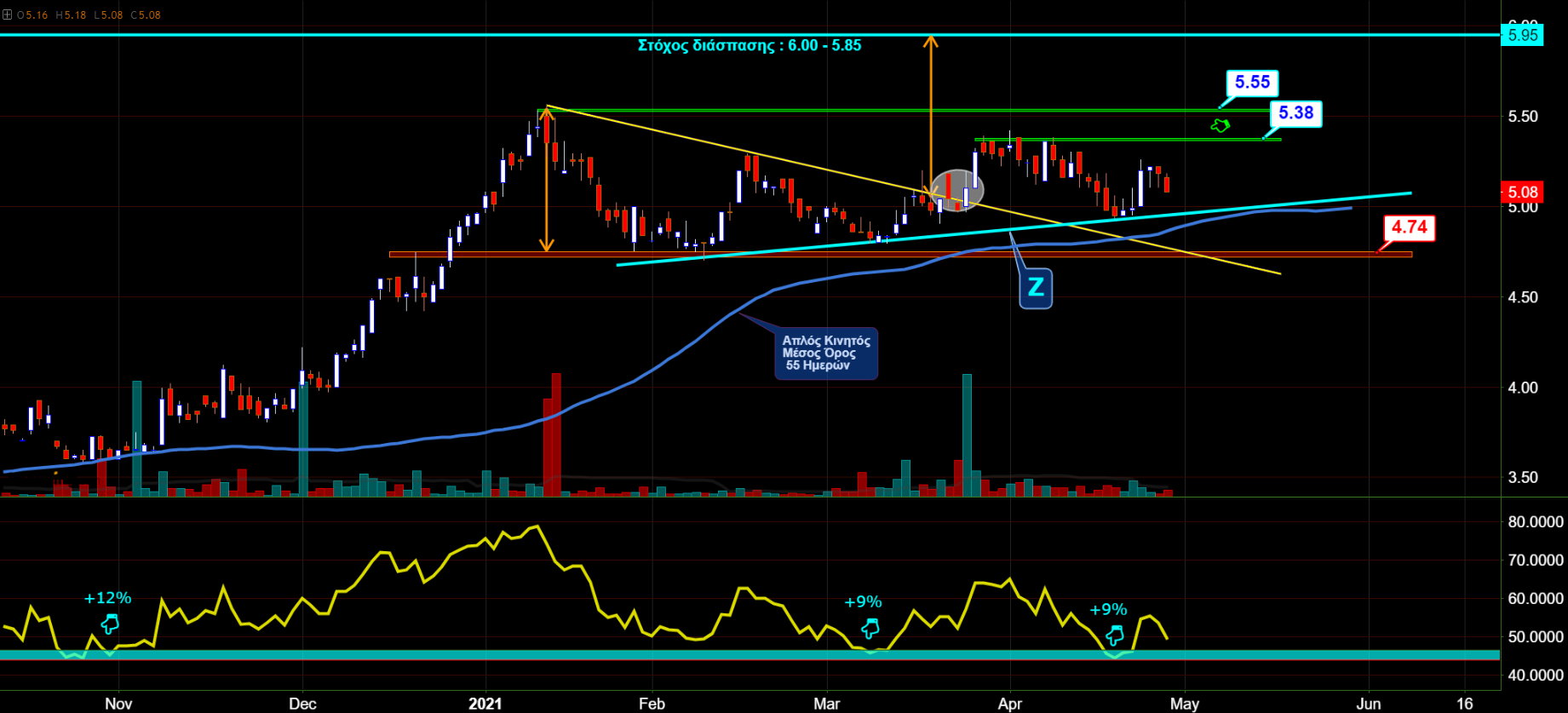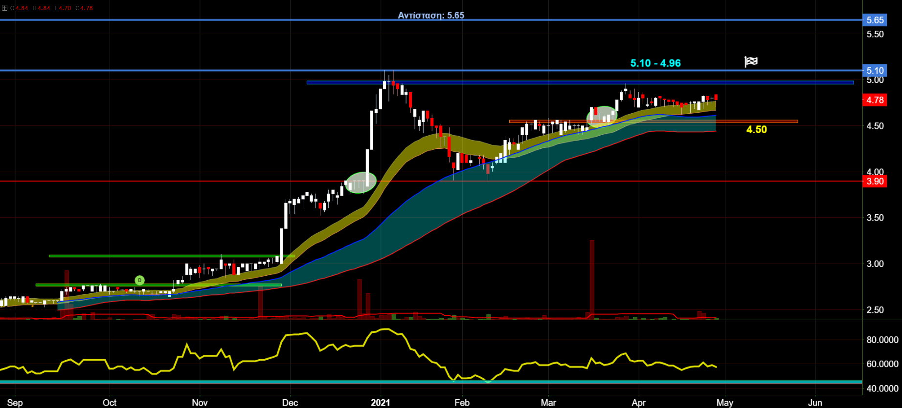 Ο όμιλος της Epsilon Net (ΕΠΣΙΛ) παρουσίασε για το 2020 κύκλο εργασιών 21,7 εκατ. ευρώ, EBITDA στα 5,14 εκατ. ευρώ και περιθώριο EBITDA 23,7%. Τα ίδια κεφάλαια ανήλθαν στις 31.12.2020 σε 20,92 εκατ. ευρώ, ο τραπεζικός δανεισμός σε 17,5 εκατ. ευρώ που όμως υπερκαλύπτεται από τα ταμειακά διαθέσιμά της που ανέρχονταν σε 20,8 εκατ. ευρώ. Η είσοδος της Epsilon Net στην Κύρια Αγορά του Χρηματιστηρίου Αθηνών φαίνεται να της έδωσε φτερά, ανεβάζοντας στόχους και ρυθμούς με τις εξαγορές της Data Communication και της Singular Logic σε συνεργασία με τη Space Hellas. Και εδώ η μετοχή παρουσιάζεται διαγραμματικά να συσσωρεύει εκτελώντας μια πλάγια κίνηση πέριξ των 4,80 με 4,70 ευρώ έχοντας ως θέα τη ζώνη αντίστασης των 5,10 με 4,96 ευρώ. Η κίνηση αυτή θα δώσει κατά ένα μεγάλο ποσοστό την ανοδική απόδραση πάνω από τα 5,10 ευρώ ανοίγοντας έτσι το έδαφος για την επόμενη περιοχή Fibo Retracement αντίστασης των 5,65 ευρώ. Ως βάση με ιδιαίτερη σημασία για τους αγοραστές θα δίναμε το επίπεδο στήριξης των 4,50 ευρώ.
