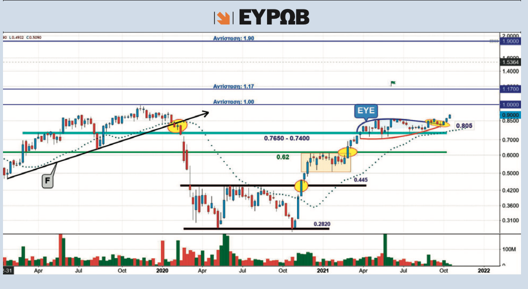 Στις επιμέρους διαγραμματικές αναλύσεις των μετοχών που απαρτίζουν τον δείκτη η Eurobank (ΕΥΡΩΒ) παρουσιάζεται να έχει επιβεβαιώσει ανοδικά τη διάσπαση του σχηματισμού "eye" στα 0,8350 ευρώ και να κατευθύνεται με αργό αλλά σταθερό ρυθμό προς το μονοπάτι, που οδηγεί στο πέρασμα των 0,98 με 1 ευρώ κάνοντας όμως πρώτα μια μικρή στάση στο όριο των 0,90 ευρώ. Πιθανή τώρα μεσοπρόθεσμη προσέλευση των τραπεζικών Bulls στην περιοχή του 1 ευρώ θα ξεκλειδώσει την πόρτα για την επίθεση προς την προσαρμοσμένη τιμή που έρχεται από το 2016 των 1,17 ευρώ. Το θέμα όμως είναι τι θα γίνει αν η τιμή της μετοχής πάει και διαλύσει ανοδικά την εν λόγω αντίσταση των 1,17 ευρώ μιας που το επόμενο σημείο ισχυρής αντίστασης εντοπίζεται στις παρυφές των 1,90 με 2 ευρώ. Τιμές, δηλαδή, που αντιπροσωπεύουν κεφαλαιοποίηση της Eurobank στα 7 δισ. ευρώ. Ακούγεται λίγο σαν σενάριο χρηματιστηριακής φαντασίας αλλά με τις τραπεζικές μετοχές όλα μπορεί να είναι πιθανά στα επόμενα χρόνια.