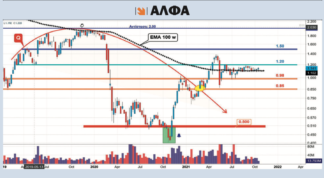 H μετοχή της Alpha Bank (ΑΛΦΑ), προσπαθώντας ίσως ακόμα να μαζέψει τα "απόνερα" της πρόσφατης αύξησης μετοχικού κεφαλαίου, κινείται από τις αρχές Αυγούστου πλαγιοσταθεροποιητικά έχοντας ως σημείο αντίστασης τα 1,20 ευρώ και ως σημείο στήριξης τα 1,08 ευρώ. Εδώ η πιθανή ανοδική δραπέτευση πάνω από τα 1,20 ευρώ θα δώσει έδαφος για τα 1,39 με 1,50 ευρώ. Και εδώ μια μεσοπρόθεσμη ανοδική διάλυση των 1,50 ευρώ θα προκαλέσει βίαιη μετατόπιση των αγοραστικών δυνάμεων προς τα υψηλά του 2019 στα 2 ευρώ. Η τρέχουσα κεφαλαιοποίηση της Alpha εντοπίζεται στα 2,67 δισ. ευρώ ενώ στην περιοχή των 2 ευρώ θα γράφει μια κεφαλαιοποίηση των 4,69 δισ. ευρώ. Το στοιχείο που χρήζει ιδιαίτερης προσοχής είναι ότι η μετοχή έχει "καβαλήσει" μετά από σχεδόν 7 χρόνια τον 100άρη Exponential κινητό μέσο όρο.