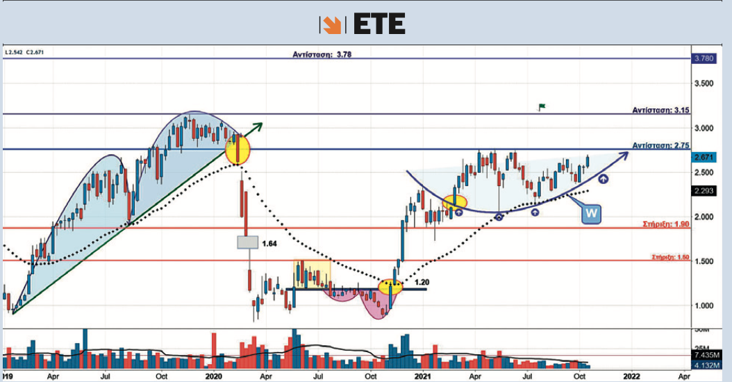 Αρκετά δυναμικά αρχίζει και αναπτύσσεται ο ανοδικός στροφέας στήριξης και μαζέματος των όποιων ρευστοποιήσεων "W" στη μετοχή της Εθνικής Τράπεζας (ΕΤΕ). Ο σχηματισμός αυτός προωθεί σταδιακά την τιμή προς το επίπεδο αντίστασης των 2,75 ευρώ δίχως μέχρι τώρα να μας έχει δείξει και όλα τα ανοδικά χαρτιά του, μιας που ο όγκος συναλλαγών δεν έχει αρχίσει να ανεβάζει στροφές. Εδώ μια πιθανή ανοδική διάσπαση των 2,75 ευρώ θα ωθήσει τη μετοχή προς τα υψηλά του 2019 στα 3,15 ευρώ. Η μεσομακροπρόθεσμη αποδέσμευση της μετοχής από τα δεσμά των 3,15 ευρώ θα δημιουργήσει διαγραμματικές σκέψεις για μια κυματική κίνηση προς την επόμενη περιοχή ισχυρής αντίστασης του καλοκαιριού του 2017, στα 3,78 ευρώ. Η κεφαλαιοποίηση της Εθνικής που τώρα βρίσκεται στα 2,45 δισ. ευρώ στα 3,78 ευρώ θα χτυπάει τα 3,46 δισ. ευρώ. Για τους τεχνικούς τύπους να αναφερθεί ότι πάνω από τα 3,78 ευρώ υπάρχει το απόλυτο κενό μιας που η ζωή φαίνεται και διαγραμματικά να ξεκινάει μετά από εκείνο το μαύρο καλοκαίρι του 2015, των capital controls.