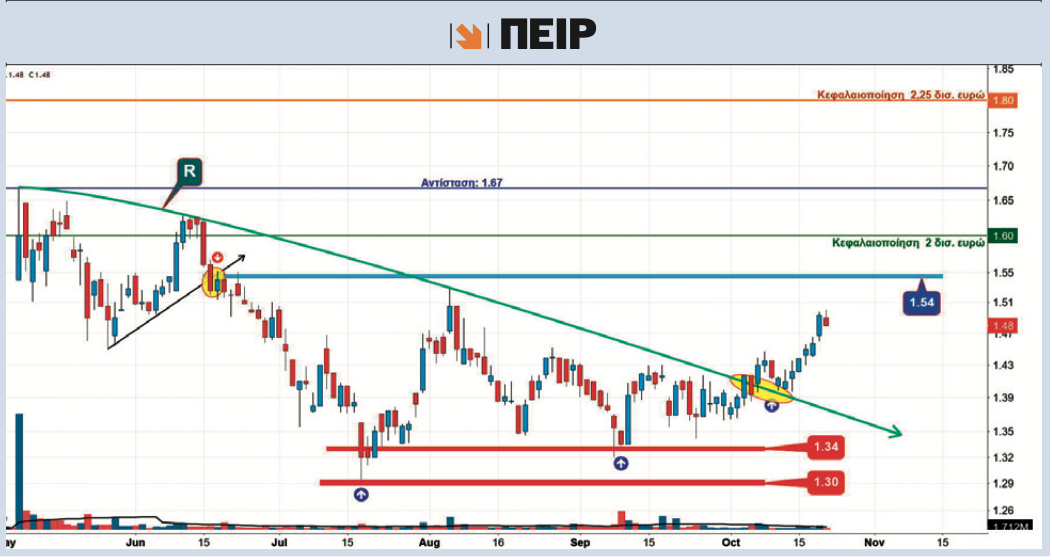 Η ανοδική διαφυγή της μετοχής της Τράπεζας Πειραιώς (ΠΕΙΡ) πάνω από τον πολύμηνο καθοδικό στροφέα αντίστασης "R" στα 1,42 ευρώ έχει προκαλέσει μια διάθεση ανηφορικής κίνησης προς την περιοχή των 1,54 ευρώ. Ο μακροπρόθεσμος στόχος της καταστρατήγησης του προαναφερόμενου σχηματισμού είναι το επίπεδο που εκτείνεται από τα 1,63 έως και τα υψηλά των 1,67 ευρώ. Μεσοπρόθεσμη ανοδική λεηλάτηση των 1,67 ευρώ θα δώσει διαγραμματικά διαπιστευτήρια για το σημείο των 1,80 ευρώ που αντιστοιχεί σε μια κεφαλαιοποίηση της Πειραιώς στα 2,25 δισ. ευρώ.