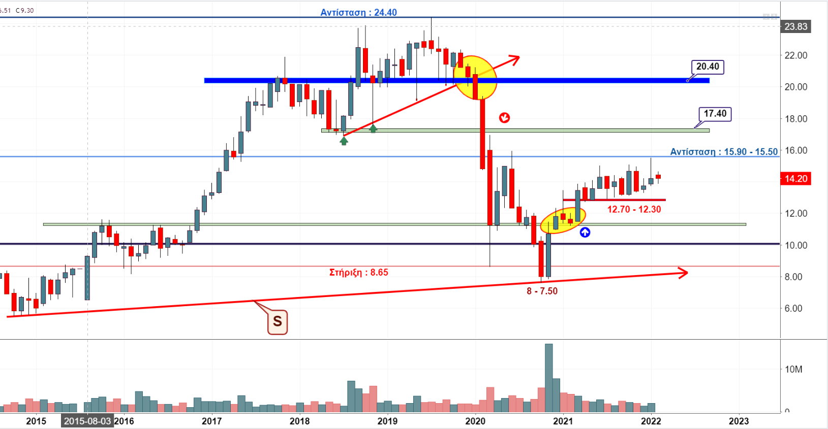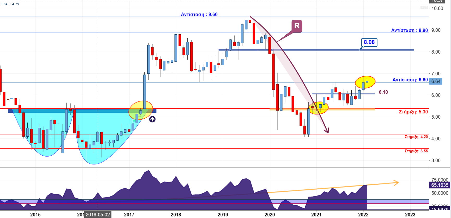 Διαγραμματικά τώρα είναι εύκολο να καταλάβει κάποιος τι ετοιμάζεται στην τιμή της μετοχής μετά και την επιβεβαιωμένη ανοδική διάσπαση της περιοχής αντίστασης των 6,60 ευρώ στο μηνιαίο chart τιμών. Το επόμενο σημαντικό σημείο αντίστασης εντοπίζεται στα 8,08 ευρώ, όπου και βρισκόταν η μετοχή στις αρχές του 2020 λίγο πριν κυλήσει στην πανδημική κρίση. Η μετοχή πάντως βάσει των συνθηκών της αγοράς αλλά κυρίως λόγω των αυξημένων προοπτικών κερδοφορίας έχει μείνει πολύ πίσω.