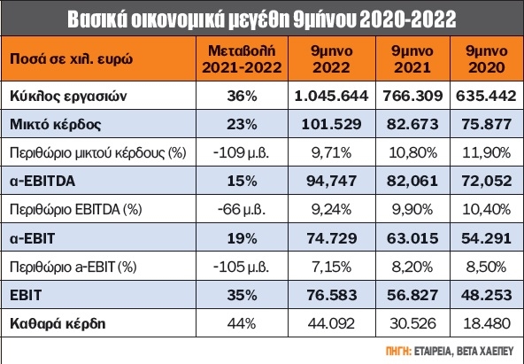 Οι πωλήσεις του ομίλου Cenergy ανήλθαν σε 1,04 δισ. ευρώ, ενισχυμένες κατά 36% σε σχέση με το αντίστοιχο 9μηνο του 2021. Η λειτουργική κερδοφορία μεγεθύνθηκε 15%, ενώ η καθαρή άγγιξε το +44%! Ωστόσο αξίζει να σημειωθεί η συρρίκνωση του προσαρμοσμένου λειτουργικού περιθωρίου κέρδους τόσο σε σχέση με το αντίστοιχο διάστημα του 2021 όσο και του 2020.