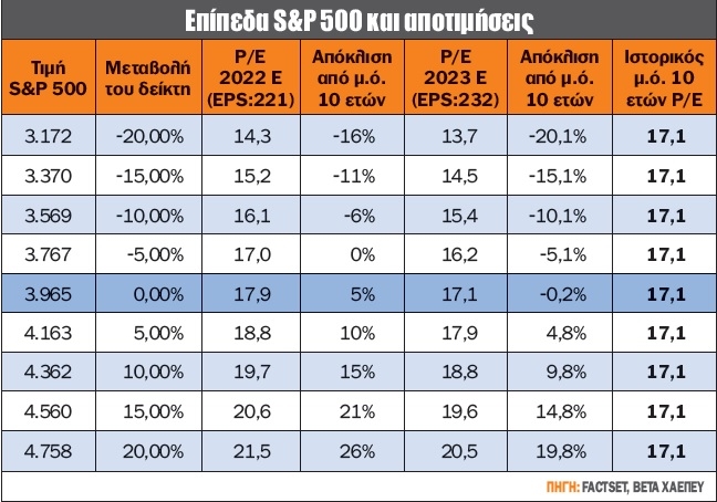 Με βάση τα ιστορικά στοιχεία, από το 1978 και ύστερα, σε περιόδους που το 10ετές των ΗΠΑ βρισκόταν στα επίπεδα 4%-6%, οι αποτιμήσεις δεν υποχώρησαν σημαντικά κάτω από τις 15 φορές, με μοναδική εξαίρεση την παγκόσμια χρηματοπιστωτική κρίση του 2008 και σε περιόδους που τα επιτόκια κινήθηκαν σε επίπεδα άνω του 8%, πράγμα το οποίο, τουλάχιστον με τα μέχρι τώρα δεδομένα, δεν διαφαίνεται ως το επικρατέστερο σενάριο.