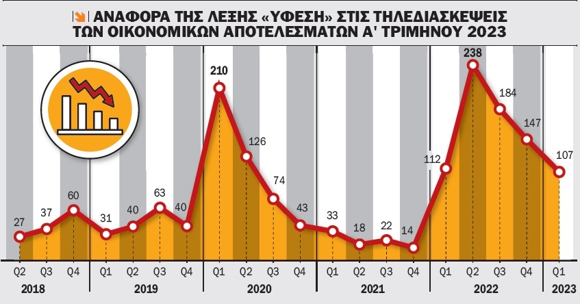 Υπενθυμίζεται ότι το β’ τρίμηνο του 2022 ο συνολικός αριθμός των εταιρειών που είχαν αναφέρει τη λέξη "ύφεση" στις τηλεδιασκέψεις τους ήταν 238 ενώ από τότε υπάρχει μία ξεκάθαρη πτωτική πορεία.