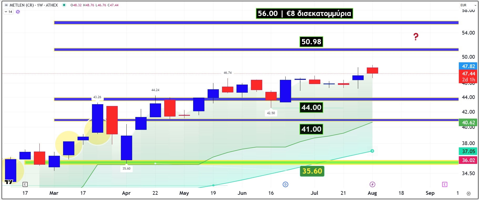 Από πλευράς διαγραμματικής ανάλυσης η μετοχή δείχνει να κάνει προθέρμανση για να αλλάξει επίπεδο περνώντας αποφασιστικά πάνω από τα €50. Στο LSE πάντως η μετοχή έγραψε νέο ιστορικό υψηλό στα €50,98, επίπεδο που αναμένεται να περάσει και η μετοχή που διαπραγματεύεται στο ΧΑΑ. Η κίνηση που φαίνεται στο εβδομαδιαίο chart να έχει ξεκινήσει από τα μέσα Μαΐου με την ανοδική διάλυση των €44 οδηγεί προς την περιοχή των €56 ευρώ δίνοντας έτσι μια κεφαλαιοποίηση στη Metlen στα €8 δισ. ευρώ.