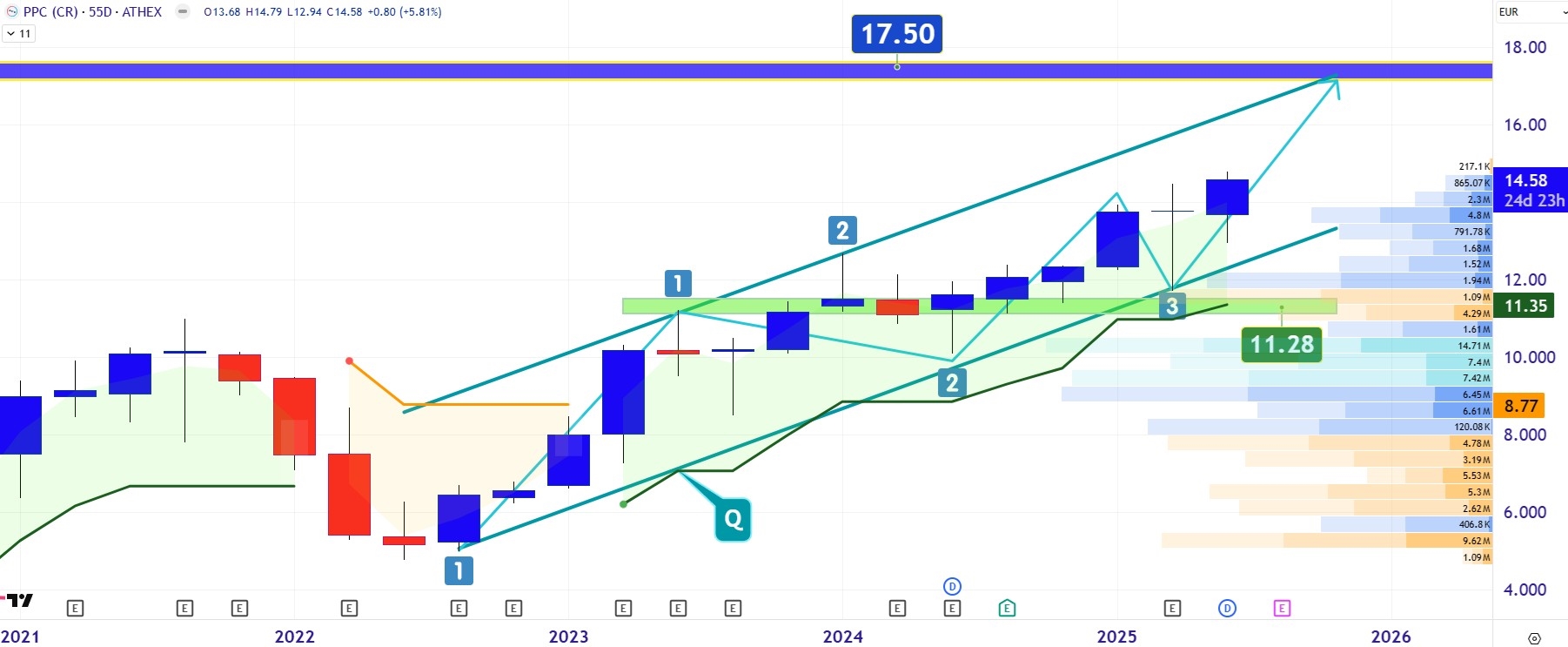 Τέλος από απόψεως διαγραμματικής ανάλυσης δεν θέλει και πολύ σκέψη για να καταλάβει κάποιος που οδηγεί το αποτυπωμένο μακροπρόθεσμο ανοδικό κανάλι "Q" στο Fibo chart των 55 ημερών. Η επόμενη στάση μετά το τελευταίο διορθωτικό κύμα στην κάτω πλευρά του καναλιού στα €11,72 είναι τα €17,50. Μάλιστα το χρονικό διάγραμμα τα εμφανίζει να τα χτυπάει η μετοχή πριν κλείσει το έτος.