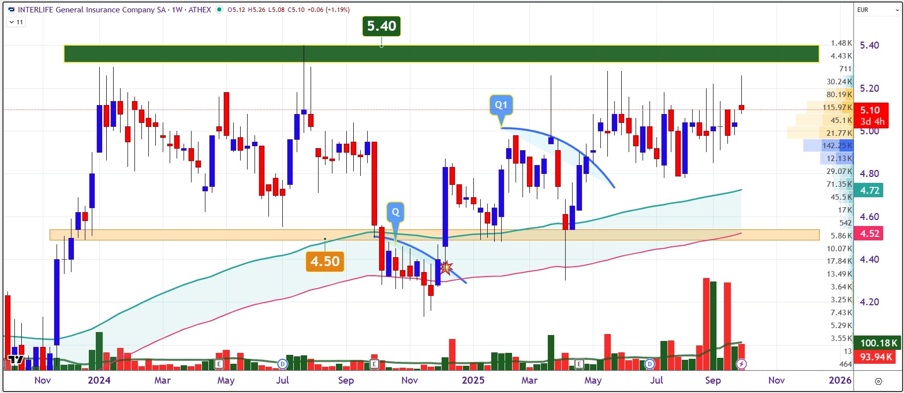 Διαγραμματικά τώρα η περιοχή εκείνη που θέλει προσοχή είναι στα €5,40. Πέρασμα πάνω από εκεί θα οδηγήσει τη μετοχή μέσα στο εύρος διακύμανσης των €6,00 με €6,20.