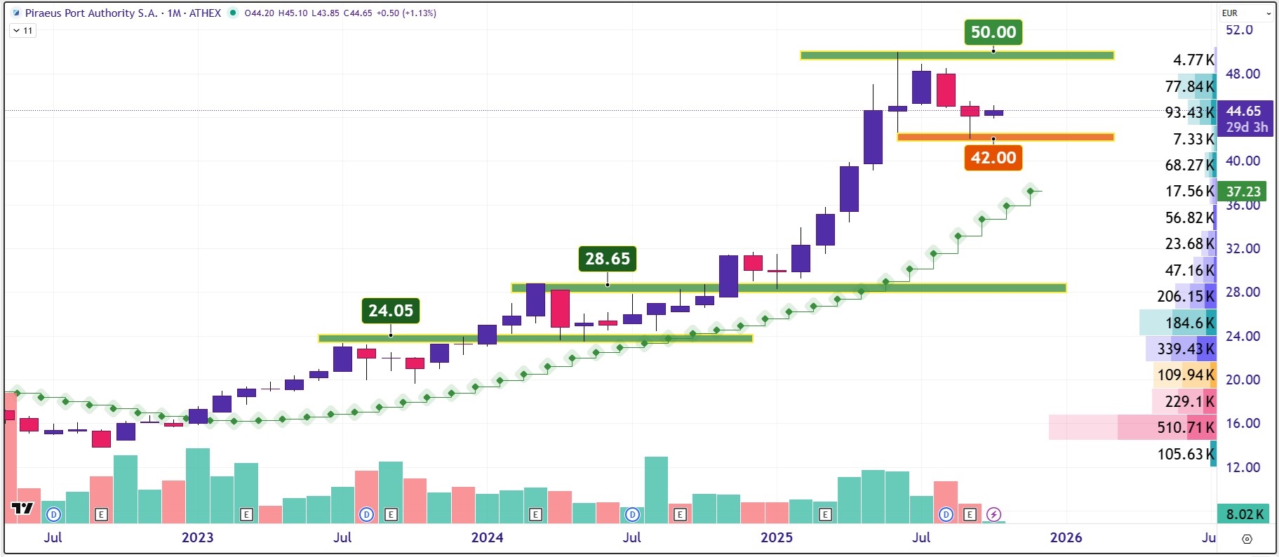 Η παρουσία στο ταμπλό αποδεικνύεται το ίδιο ισχυρή, με τη μετοχή του ΟΛΠ να έχει ενισχυθεί από την αρχή της χρονιάς έως και +70%, ξεπερνώντας κατά πολύ τον Γενικό Δείκτη του Χ.Α. (+46,5%). Στη διαγραμματική ανάλυση η μετοχή δείχνει να έχει πατήσει πάνω στη στήριξη των 42 ευρώ και να επιχειρεί να διαμορφώσει ένα βατήρα υψηλότερα, στα 44 ευρώ, ώστε να ξαναδοκιμάσει στην πορεία τη ζώνη αντίστασης των 48 με 50 ευρώ. Πάνω από εκεί θα δοθεί έδαφος στους αγοραστές για να κινηθούν προς τα 60 ευρώ.