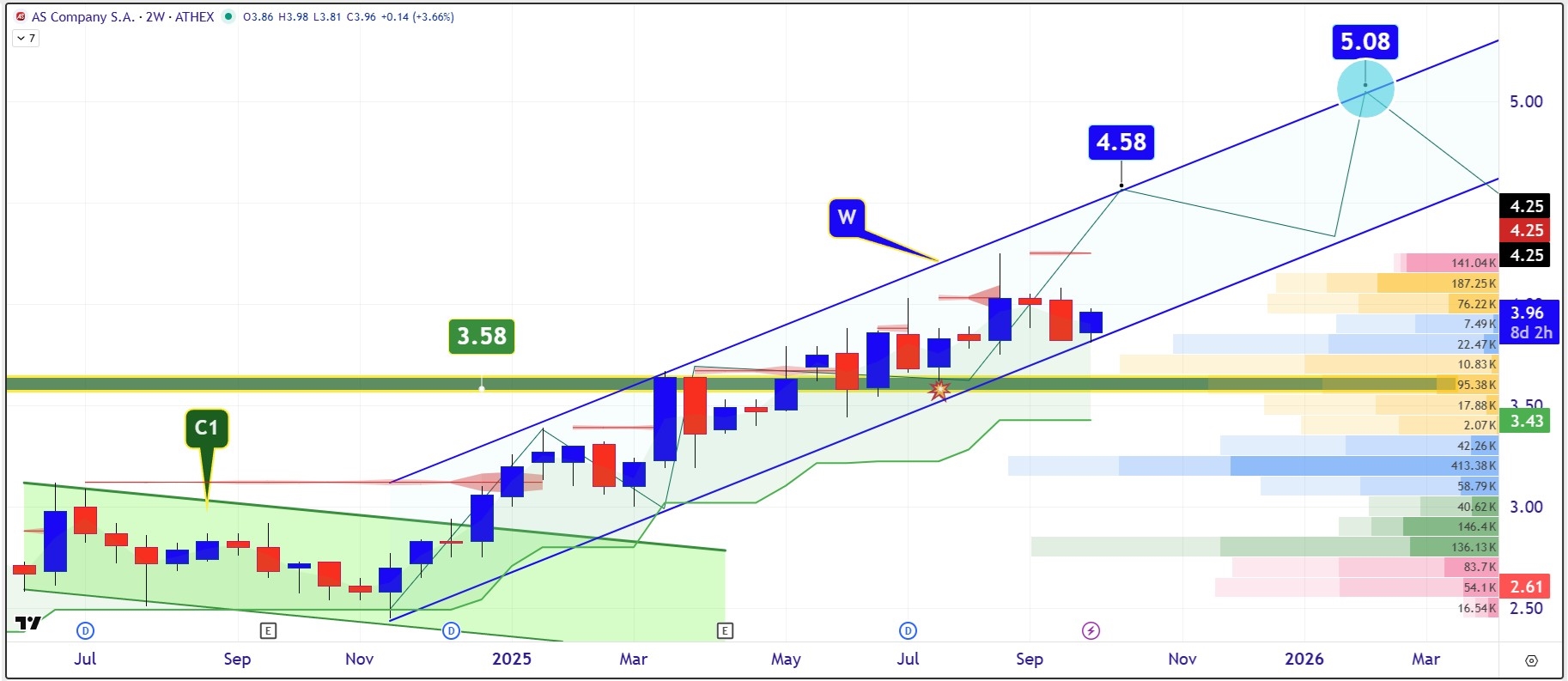 Με κεφαλαιοποίηση €51,7 εκατ., η AS Company εμφανίζεται αρκετά ελκυστική. Αν αφαιρεθεί η ρευστότητα, η επιχείρηση αποτιμάται ουσιαστικά μόλις €33 εκατ., με P/E χαμηλό, δεδομένης της εκτίμησης για βελτιωμένο δεύτερο εξάμηνο. Ο συνδυασμός υψηλής ρευστότητας, μηδενικού δανεισμού, διαρκούς ανάπτυξης πωλήσεων και δέσμευσης για γενναιόδωρη πολιτική μερισμάτων δημιουργεί ένα ισχυρό επενδυτικό αφήγημα. Στη διαγραμματική ανάλυση η μετοχή φαίνεται να πατάει στο κάτω μέρος του μακροπρόθεσμου ανοδικού καναλιού "W" και να ετοιμάζεται να συνεχίσει την πορεία της προς την περιοχή από όπου διέρχεται η άνω πλευρά στα €4,30 με €4,58. Η μετοχή πάντως σε αυτά τα επίπεδα τιμών δίνει πρόσβαση σε έναν όμιλο που αναπτύσσεται σταθερά, έχει προοπτική επέκτασης στο εξωτερικό και παράλληλα διαθέτει τα κεφάλαια να ανταμείψει έμπρακτα τους μετόχους του.