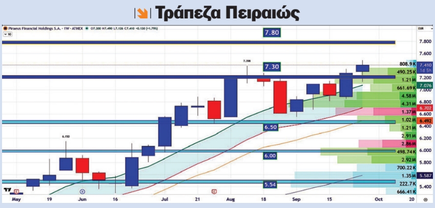 Την ώρα που γραφόταν το άρθρο η Πειραιώς έγραφε νέο υψηλό πολλών ετών στα 7,49 ευρώ, ξεπερνώντας το προηγούμενο των 7,398 ευρώ που είχε σημειωθεί στις 12 Αυγούστου. Το στοιχείο αυτό επιβεβαιώνει και με το παραπάνω τη βραχυχρόνια τάση και διάθεση των επενδυτών για υψηλότερα νούμερα. Η παραμονή της μετοχής και στις επόμενες συνεδριάσεις πάνω από τα 7,30 ευρώ θα ανοίξει διάπλατα τον ανηφορικό δρόμο για την επόμενη περιοχή αντίστασης των 7,80 ευρώ. Σημείο-κλειδί σε ένα pullback της μετοχής είναι το επίπεδο των 7,10 ευρώ.