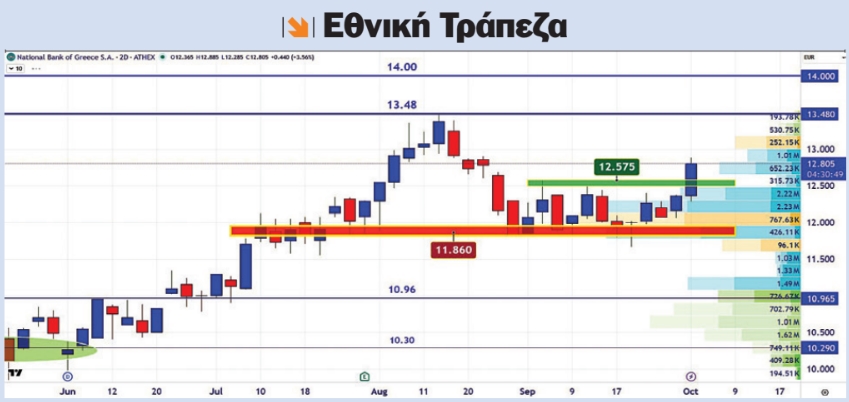 Η μετοχή της Εθνικής Τράπεζας καταγράφει ανοδική αντίδραση μετά την ισχυρή στήριξη που πρόβαλε για πάνω από 22 ημέρες η ζώνη των 12 με 11,86 ευρώ, επιβεβαιώνοντας έτσι τη σημασία της ως "αμυντικού ορίου". Η άρνηση αυτή έχει φέρει τη μετοχή στις τελευταίες συνεδριάσεις να προκαλεί ένα ανοδικό ρήγμα στη βραχυχρόνια αντίσταση των 12,575 ευρώ, ανοίγοντας έτσι τον δρόμο για την πιθανή ανάβασή της προς τα υψηλά που είχε σημειώσει στα 13,48 ευρώ στις 14 Αυγούστου. Πάνω από εκεί θα βρεθεί στο κατώφλι του ψυχολογικού ορίου των 14 ευρώ.
