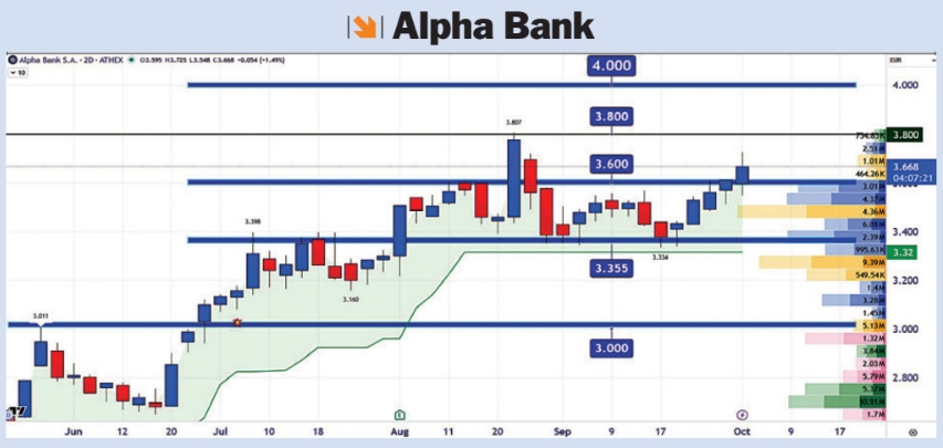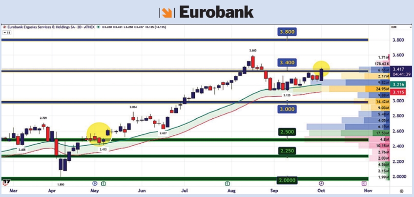 Από τις επιμέρους διαγραμματικές αναλύσεις η μετοχή της Eurobank αποτυπώνει μια επαναφορά πάνω από το κρίσιμο επίπεδο αντίστασης των 3,40 ευρώ, με αυξημένο όγκο συναλλαγών, στοιχείο που, αν επιβεβαιωθεί με ημερήσιο κλείσιμο, θα ενισχύσει το ανοδικό τασικό σήμα. Η ζώνη των 3,20 με 3,16 ευρώ λειτουργεί ως ισχυρή στήριξη, ενώ η επόμενη αντίσταση στην περίπτωση που η μετοχή αποδράσει από τα 3,40 είναι τα 3,80 ευρώ. Να σημειώσω εδώ ότι το προηγούμενο υψηλό που σημειώθηκε στα μέσα του περασμένου Αυγούστου ήταν στα 3,60 ευρώ.