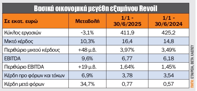Τα καθαρά κέρδη του ομίλου Revoil για το α’ εξάμηνο 2025 ανήλθαν σε 0,8 εκατ. ευρώ, έναντι 0,6 εκατ. ευρώ το αντίστοιχο περυσινό διάστημα, κυρίως λόγω της μείωσης του χρηματοοικονομικού κόστους αλλά και των μειωμένων τιμών στα καύσιμα σε σχέση με την αντίστοιχη περσινή περίοδο. Τα λειτουργικά κέρδη (EBITDA) του ομίλου διαμορφώθηκαν στα 6,8 εκατ. ευρώ, έναντι 6,2 εκατ. ευρώ το α’ εξάμηνο του 2024, σημειώνοντας αύξηση κατά 10% περίπου, η οποία κατά κύριο λόγο οφείλεται στη συνεισφορά της δραστηριότητας των ΑΠΕ κατά 0,56 εκατ. ευρώ. Υπενθυμίζεται ότι ο στόχος της εταιρείας για τις ΑΠΕ είναι 200 MW το 2030!