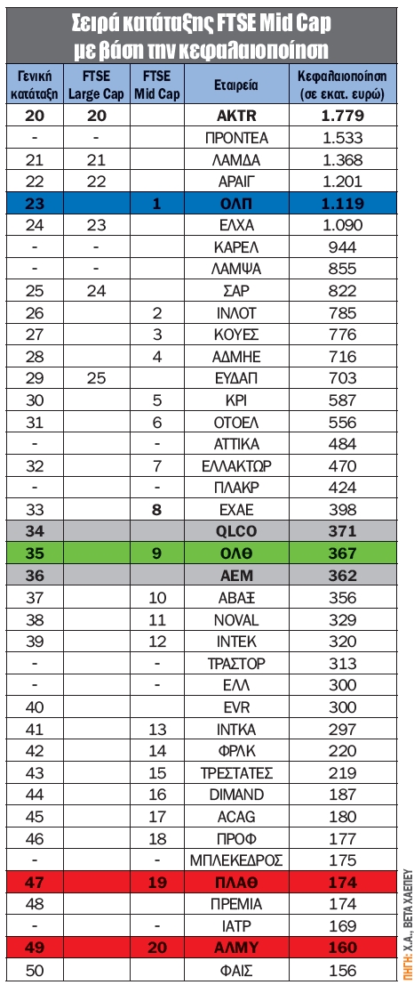 Στην τρέχουσα κατάσταση καμία εταιρεία του FTSE Mid Cap δεν βρίσκεται χαμηλότερα της 56ης θέσης, ώστε να έχουμε αυτόματη διαγραφή.