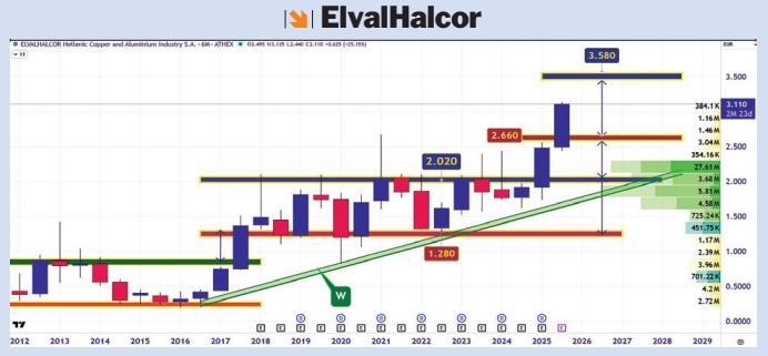 Προχωράω στην ElvalHalcor (ΕΛΧΑ), που έχει διαλύσει ανοδικά το όριο των 3 ευρώ, ανοίγοντας πλέον μέτωπο με την περιοχή των 3,58 με 3,74 ευρώ. Ο όμιλος ολοκλήρωσε το πρώτο εξάμηνο του 2025 με σημαντική άνοδο κερδοφορίας και βελτίωση χρηματοοικονομικής θέσης, συνεχίζοντας τη θετική πορεία των τελευταίων ετών. Ο ενοποιημένος κύκλος εργασιών αυξήθηκε κατά 8%, στα 1,86 δισ. ευρώ, το a-EBITDA ενισχύθηκε κατά 18,1%, στα 134,4 εκατ. ευρώ, ενώ τα καθαρά κέρδη διαμορφώθηκαν στα 70,9 εκατ. ευρώ, αυξημένα κατά 51% σε σχέση με το προηγούμενο έτος. Παράλληλα, η σημαντική μείωση του καθαρού δανεισμού κατά 111 εκατ. ευρώ σε συνδυασμό με τα χαμηλότερα επιτόκια οδήγησαν σε μείωση του χρηματοοικονομικού κόστους κατά 23,3%, ενισχύοντας περαιτέρω την καθαρή κερδοφορία. Η εταιρεία πέτυχε να περιορίσει το επενδυτικό της πρόγραμμα χωρίς να ανακόψει την παραγωγική της δυναμική, ενώ τα μικτά κέρδη αυξήθηκαν στα 165,2 εκατ. ευρώ, από 141,2 εκατ. ευρώ πέρυσι. Με συνεχή βελτίωση στην αποδοτικότητα, εξωστρέφεια και εύρωστη κεφαλαιακή βάση, η ElvalHalcor επιβεβαιώνει τον ρόλο της ως σταθερού βιομηχανικού πυλώνα για την ελληνική μεταλλουργία και την ευρωπαϊκή αγορά.