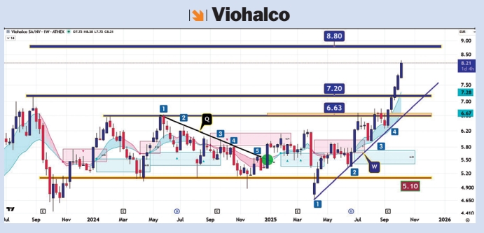 Κάπως έτσι "άναψε" και η φλόγα στο ταμπλό, με τη Viohalco (ΒΙΟ) να σημειώνει άνοδο +32% από τα χαμηλά του Σεπτεμβρίου και να περνά σε νέα ιστορικά υψηλά στα 8,30 ευρώ. Διαγραμματικά, η μετοχή δείχνει, με την έντονη ανοδική γωνία κλίσης που έχει αναπτύξει, ότι κατευθύνεται προς το σαθρό επίπεδο αντίστασης των 8,80 με 9 ευρώ. Να υπενθυμίσω ότι η Viohalco κατέγραψε το ισχυρότερο πρώτο εξάμηνο στην ιστορία της, διπλασιάζοντας τα καθαρά κέρδη στα 177 εκατ. ευρώ και ανεβάζοντας τον κύκλο εργασιών στα 3,7 δισ. (+14%). Η λειτουργική κερδοφορία έφτασε τα 378 εκατ. ευρώ (+39%), με όλα τα βασικά παραγωγικά μέτωπα να αποδίδουν πολύ πάνω από τις αρχικές προσδοκίες. Ο κλάδος αλουμινίου συνέχισε σε τροχιά έντονης ζήτησης από τη συσκευασία, ο χαλκός ενισχύθηκε από τα έργα data centers και τις υψηλές τιμές του LME, ενώ τα καλώδια παραμένουν αιχμή ανάπτυξης με επενδύσεις σε Ελλάδα και ΗΠΑ. Οι σωλήνες χάλυβα κινήθηκαν με έργα υψηλού περιθωρίου και ο χάλυβας έδειξε ξεκάθαρα σημάδια επανεκκίνησης.