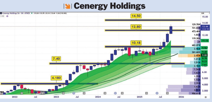 Τίποτα δεν μπορεί να σταθεί εμπόδιο στο "θηρίο", τη Cenergy Holdings (CENER), με τη μετοχή να γράφει από τα χαμηλά του Σεπτεμβρίου ένα +35% και να σημειώνει νέα ιστορικά υψηλά στα 13,70 ευρώ. Ο στόχος εδώ εντοπίζεται στα 14,50 με 15 ευρώ. Μια Cenergy που επιβεβαίωσε στο πρώτο εξάμηνο του 2025 τον ρόλο της ως κορυφαίου βιομηχανικού εξαγωγέα της χώρας, παρουσιάζοντας επιδόσεις που συνδυάζουν ανάπτυξη, ισχυρά περιθώρια και συνεχή επέκταση έργων. Οι πωλήσεις ξεπέρασαν το 1 δισ. ευρώ (+26%), το αναπροσαρμοσμένο EBITDA εκτινάχθηκε στα 171 εκατ. ευρώ (+43%), ενώ τα καθαρά κέρδη αυξήθηκαν κατά 69%, στα 95 εκατ. ευρώ, επιβεβαιώνοντας το ισχυρό momentum σε όλους τους τομείς.