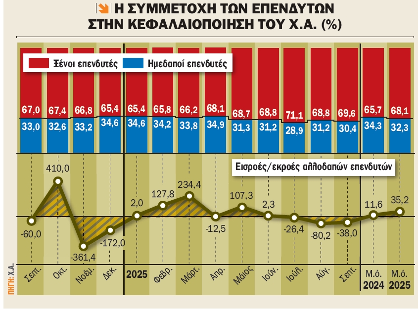Η συμμετοχή των ξένων επενδυτών στη συνολική κεφαλαιοποίηση της ελληνικής αγοράς τον Σεπτέμβριο ανήλθε στο 69,57%, έναντι 68,83% στις 29 Αυγούστου 2025, καταγράφοντας αύξηση 74 μ.β. Η κεφαλαιοποίηση του Χ.Α. στις 30/9/2025 υπολογίστηκε στα 118,5 δισ. ευρώ, έναντι 118,1 δισ. ευρώ τον προηγούμενο μήνα, ήτοι μεγέθυνση 0,32%, ενώ ο ΓΔΤ αναρριχήθηκε +0,62%.