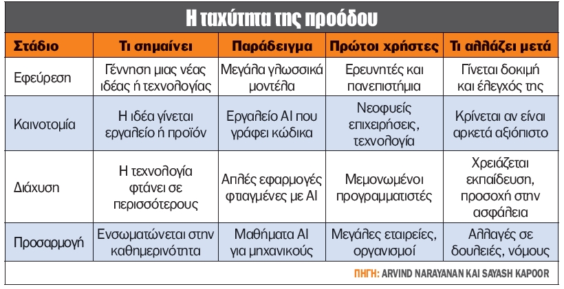 Προηγούμενες τεχνολογίες: Ο προσωπικός υπολογιστής εξαπλώθηκε επίσης αργά, χρειάστηκαν δεκαετίες μέχρι να γίνει απαραίτητος σε κάθε γραφείο. Το ίδιο μπορεί να ισχύει και για την τεχνητή νοημοσύνη, ειδικά σε τομείς κρίσιμους για την ασφάλεια, όπως η ιατρική, η αεροπορία ή τα χρηματοοικονομικά, όπου τα λάθη είναι δαπανηρά.